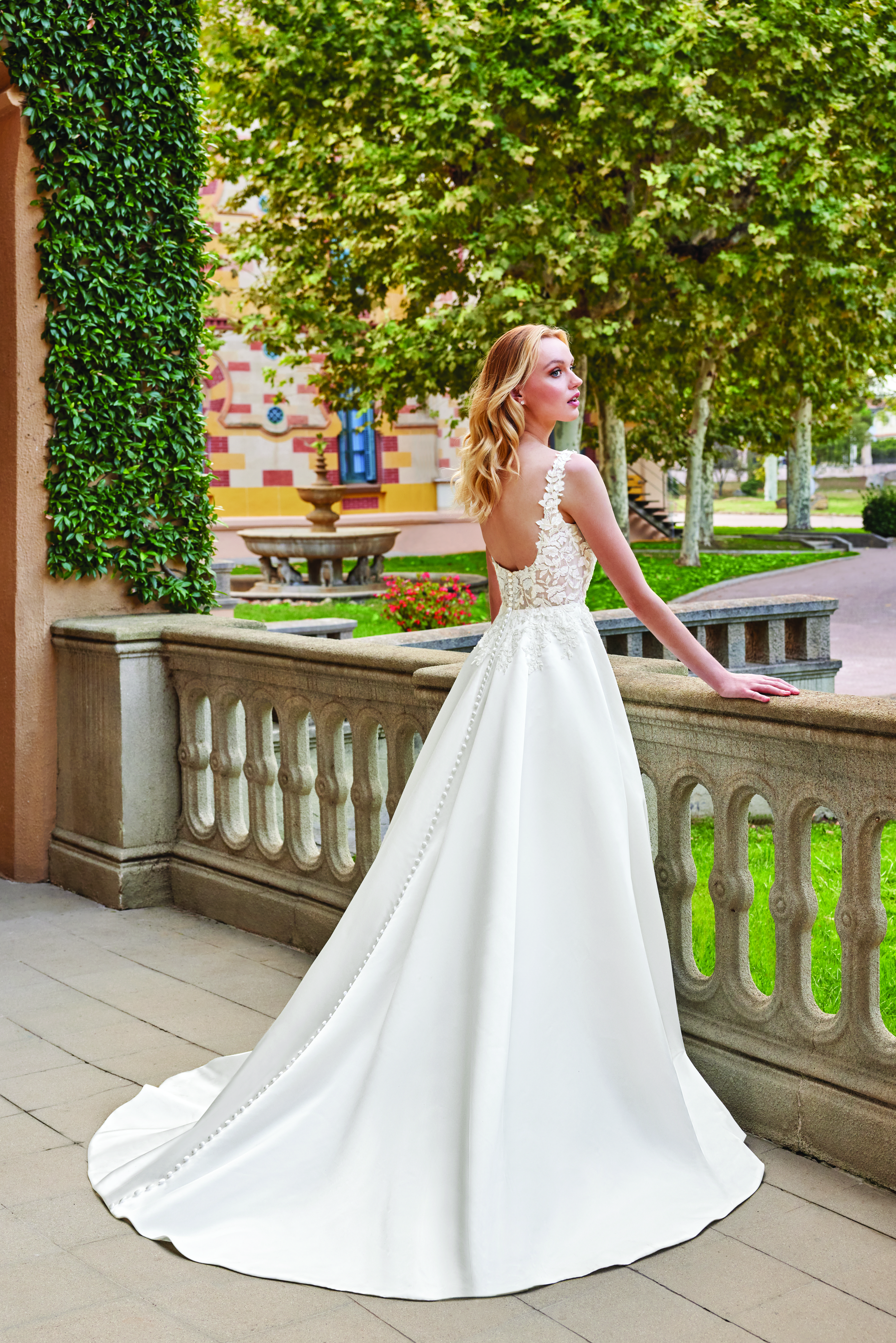 Der offene Rücken verleiht dem Kleid eine verführerische Note, die durch die zarten Spitzenapplikationen am Rand des Rückens perfekt in Szene gesetzt wird. Die Knopfleiste, die sich entlang des Rückens bis in den Rock zieht, fügt eine klassische Eleganz hinzu und vervollständigt das Design auf stilvolle Weise.