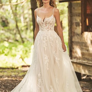 Dieses elegante A-Linien-Brautkleid ist die perfekte Wahl für Bräute, die einen romantischen und zugleich modernen Look suchen. Das Kleid besticht durch ein florales Spitzenoberteil, das kunstvoll mit transparentem Tüll gearbeitet ist. Der tiefe V-Ausschnitt betont das Dekolleté auf anmutige Weise und sorgt für einen verführerischen, aber dennoch klassischen Look.