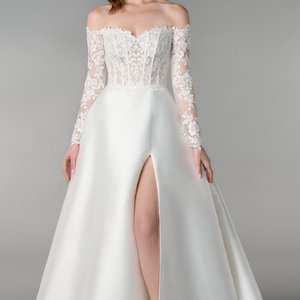 Der cleane Stil und der edle Satinstoff verleihen dem Brautkleid eine luxuriöse Ausstrahlung – ganz ohne überladen zu wirken. Die figurbetonte Passform schmeichelt Deiner Silhouette und sorgt für einen wow-würdigen Auftritt.