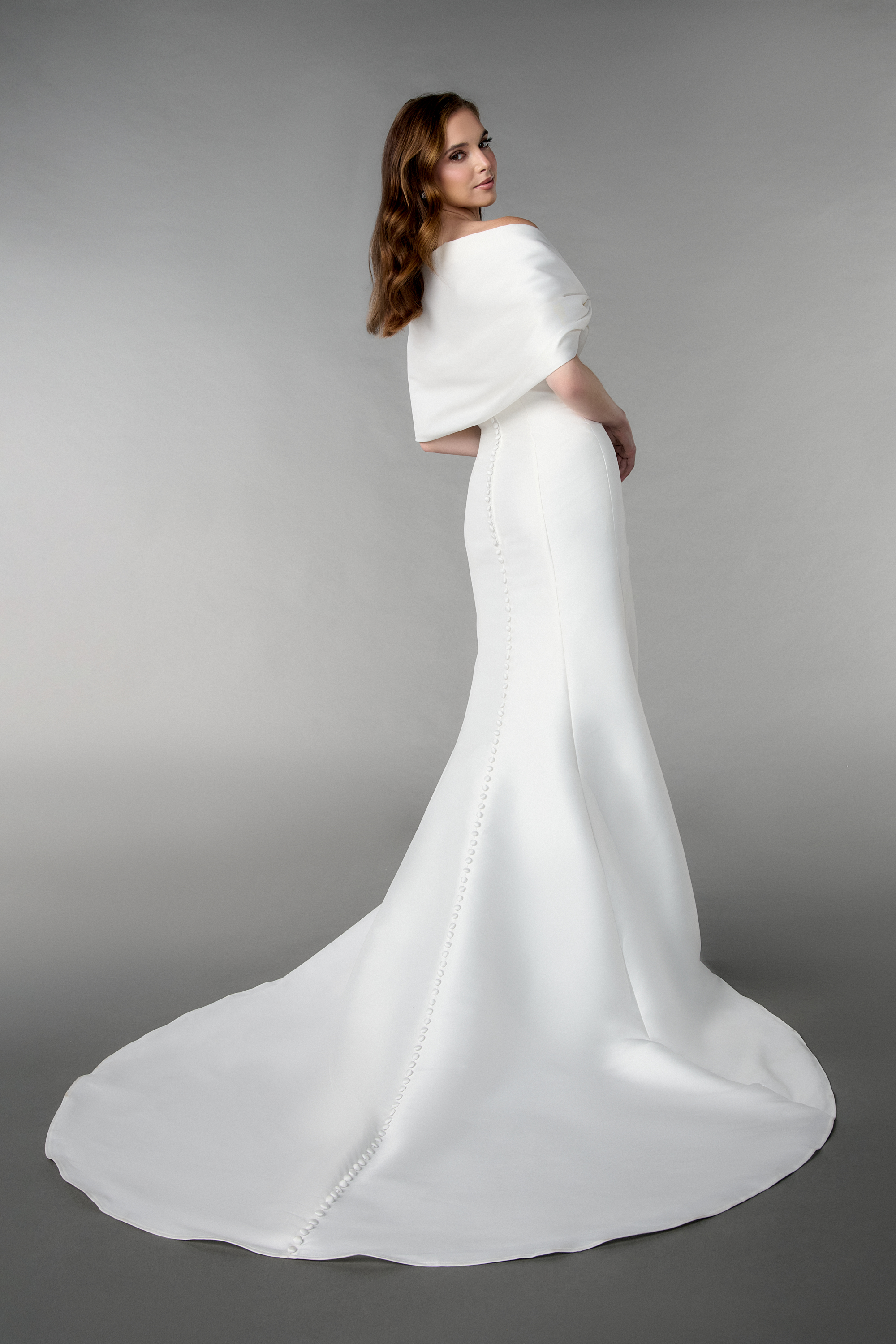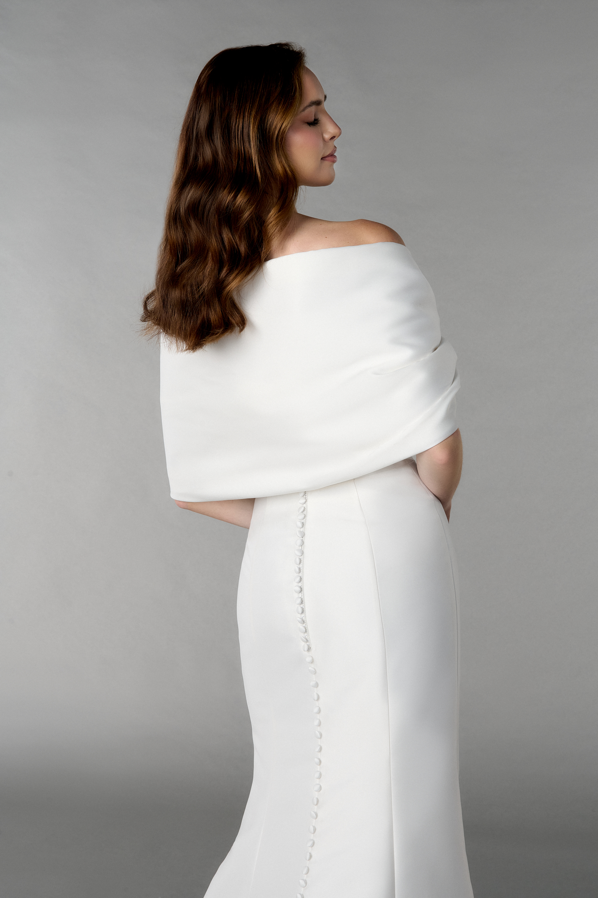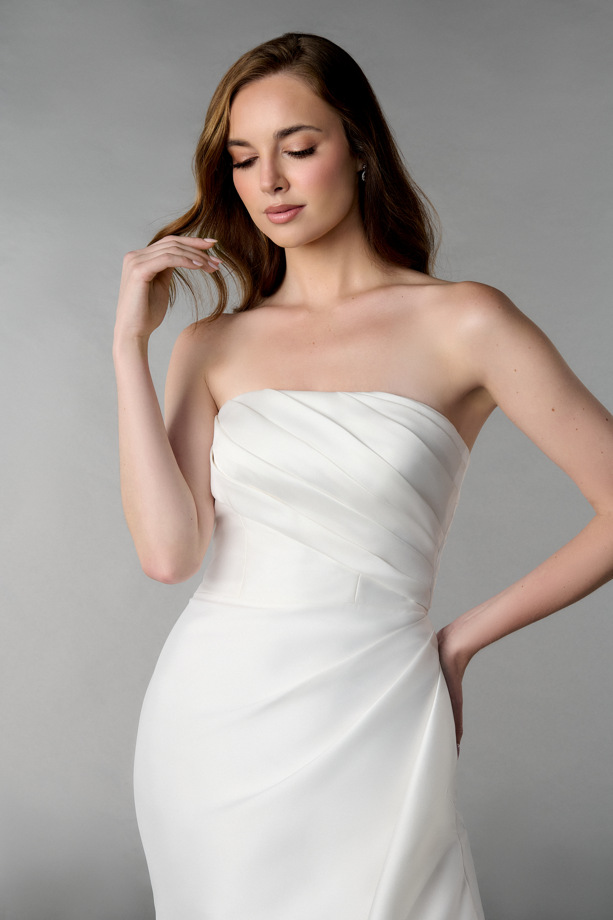 Besonders raffiniert an diesem Hochzeitskleid: Das trägerlose Oberteil mit zarten Drapierungen und der abnehmbare Schal, der sich locker über die Schultern legen lässt – perfekt für zwei Looks in einem Kleid. Der hohe Beinschlitz bringt eine Portion Extravaganz und Leichtigkeit, während die lange Knopfleiste am Rücken klassisch-elegante Akzente setzt.