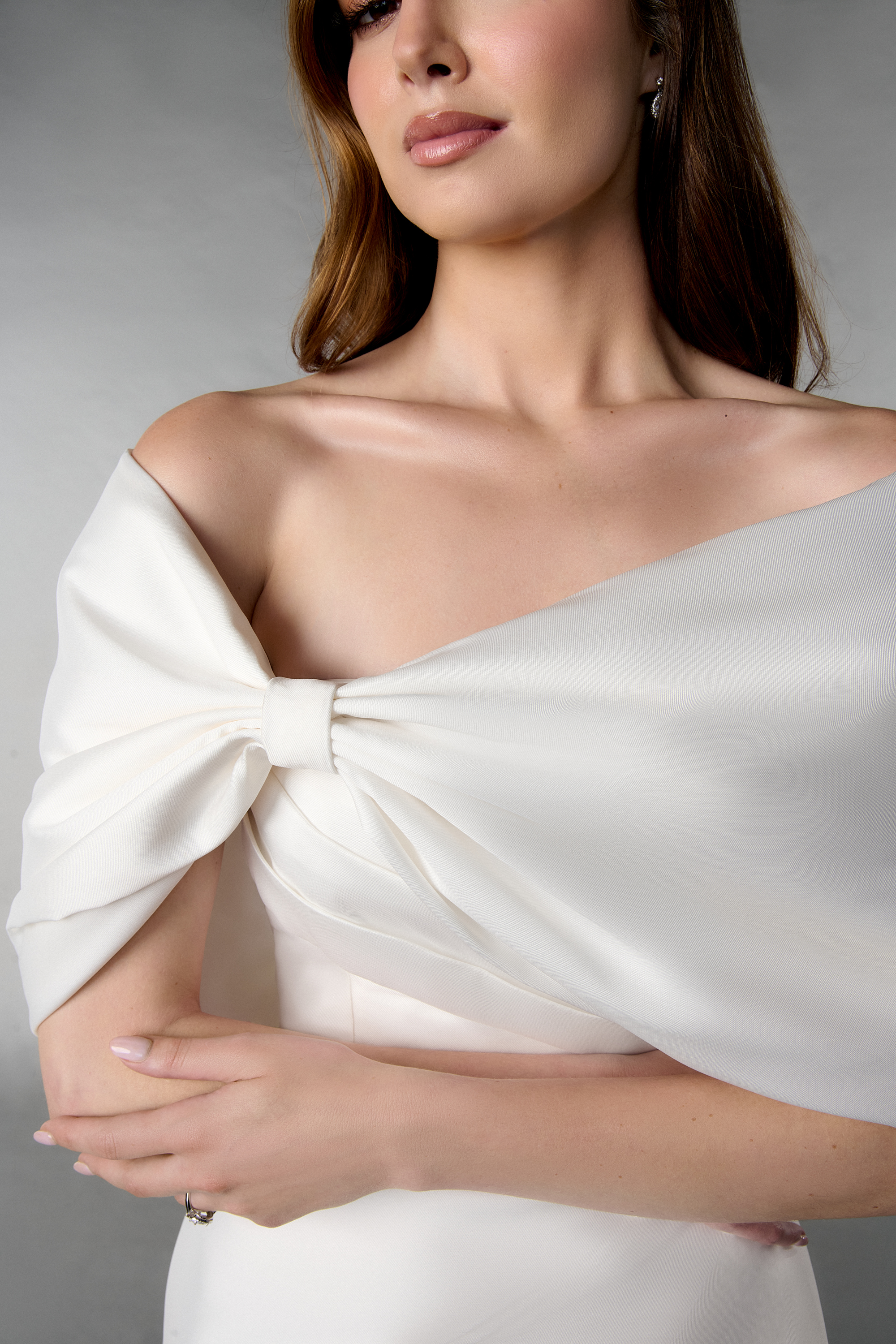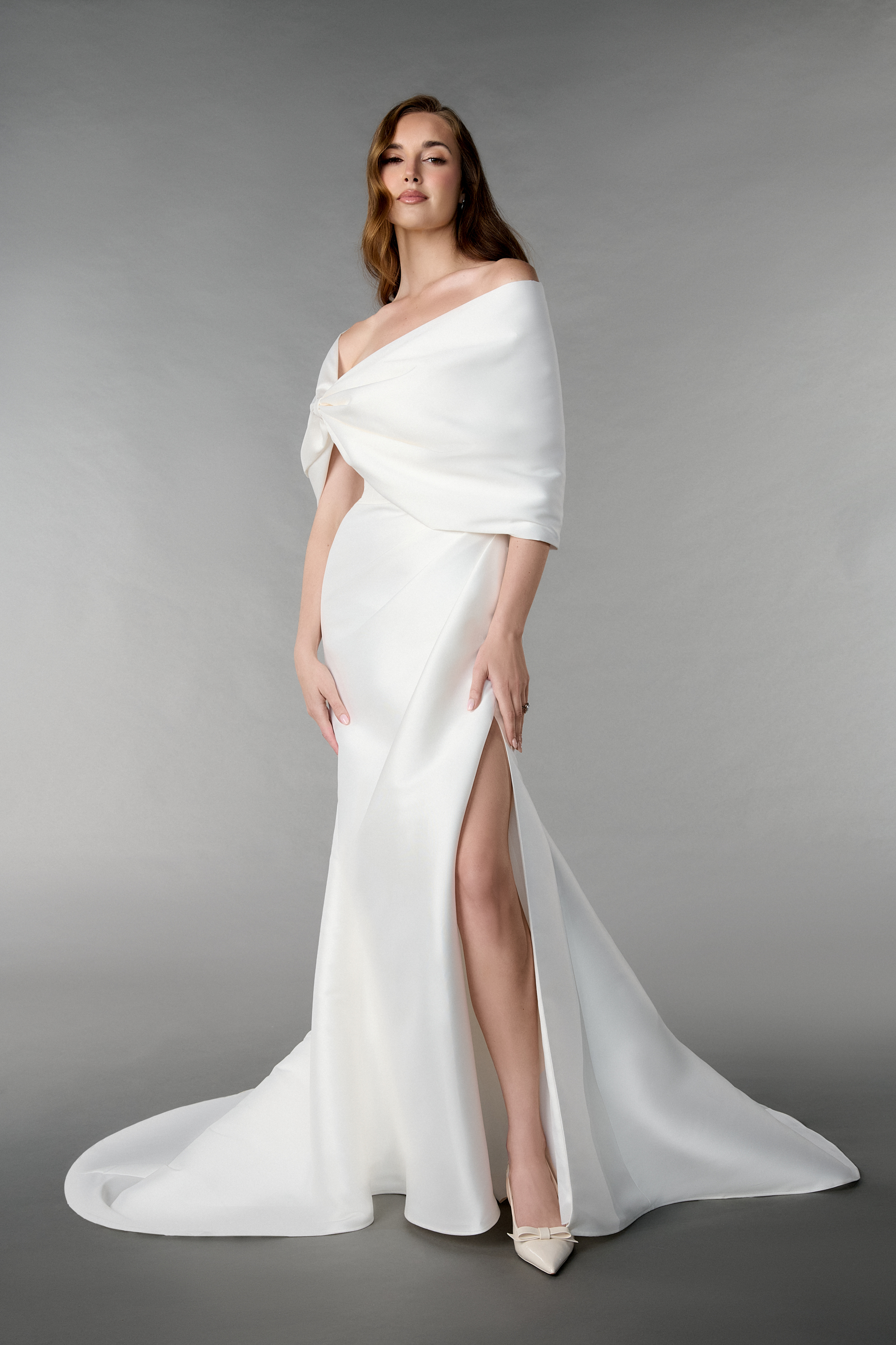 Dieses elegante Brautkleid ist wie gemacht für stilbewusste Bräute, die klare Linien und moderne Schlichtheit lieben. Ein echtes Statement-Piece unter den Satin Brautkleidern – stilvoll, selbstbewusst und absolut zeitlos.
