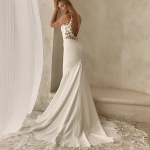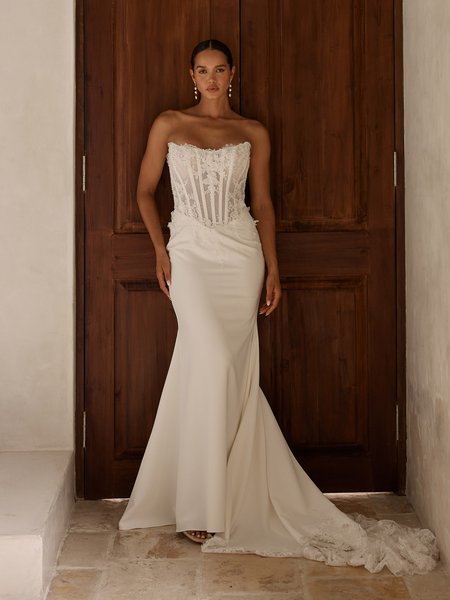 Der Rock aus hochwertigem Crêpe bildet einen ruhigen, fließenden Kontrast zur detailreichen Corsage. Sein klarer Fall unterstreicht die moderne Eleganz des Kleides und endet in einer zarten Schleppe, die dem Look eine stilvolle Präsenz verleiht, ohne aufdringlich zu wirken. Dieses Brautkleid ist ideal für zukünftige Bräute, die klare Linien lieben und dennoch nicht auf feine Spitzen- und Perlendetails verzichten möchten.