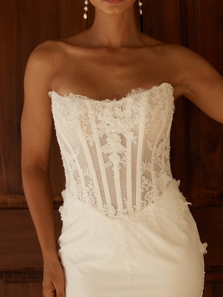 Im Fokus steht das kunstvoll gestaltete Corsagen-Oberteil. Florale Spitze liegt auf einer fein transparenten Basis und wird von formgebenden Stäbchen strukturiert, die die Figur elegant betonen. In die Spitze sind zart schimmernde Perlen eingearbeitet, die dem Design Tiefe verleihen und bei Bewegung sanft das Licht einfangen. Die Kombination aus Transparenz, Spitze und feinen Details wirkt modern, feminin und besonders hochwertig.