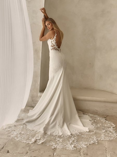 Der Rock aus hochwertigem Crêpe fällt fließend und glatt nach vorne und bildet einen eleganten Kontrast zum detailreichen Oberteil. Nach hinten geht er in eine zarte Spitzen-Schleppe über, die dem Kleid Bewegung und einen romantischen Abschluss verleiht – leicht, modern und zeitlos.