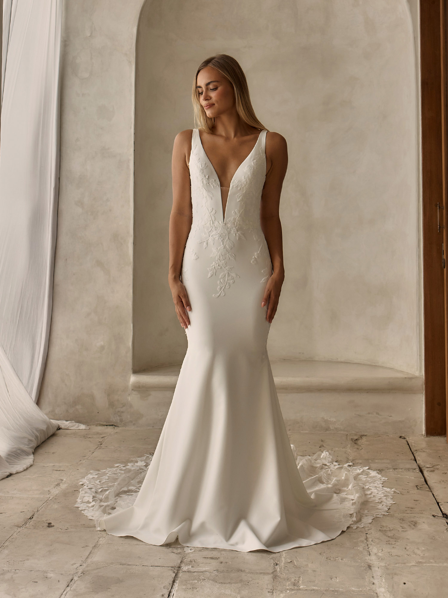 Dieses Fit-&-Flare Brautkleid vereint moderne Klarheit mit einer sanft femininen Ausstrahlung. Der körpernahe Schnitt folgt der Silhouette auf elegante Weise und öffnet sich ab dem Knie in einen weich fließenden Rock, der dem Look Ruhe und Leichtigkeit verleiht.