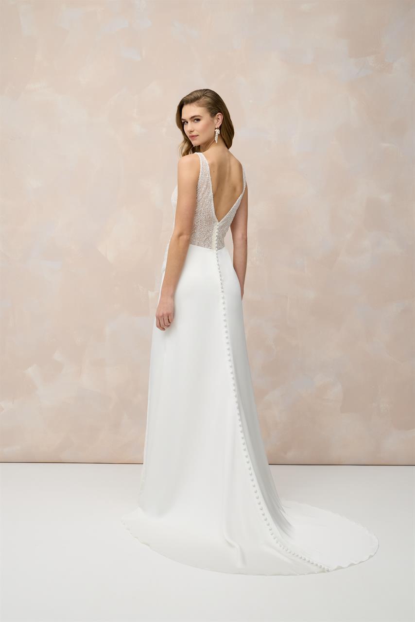 Der Rock des Brautkleides aus edlem Satin schmiegt sich fließend an Deine Figur und öffnet sich in einen eleganten Schlitz – ein Detail, das Deine Beine in Szene setzt und gleichzeitig Bewegungsfreiheit schenkt. Die fließende Schleppe mit Knopfleiste sorgt für ein elegantes Finale dieses Looks.