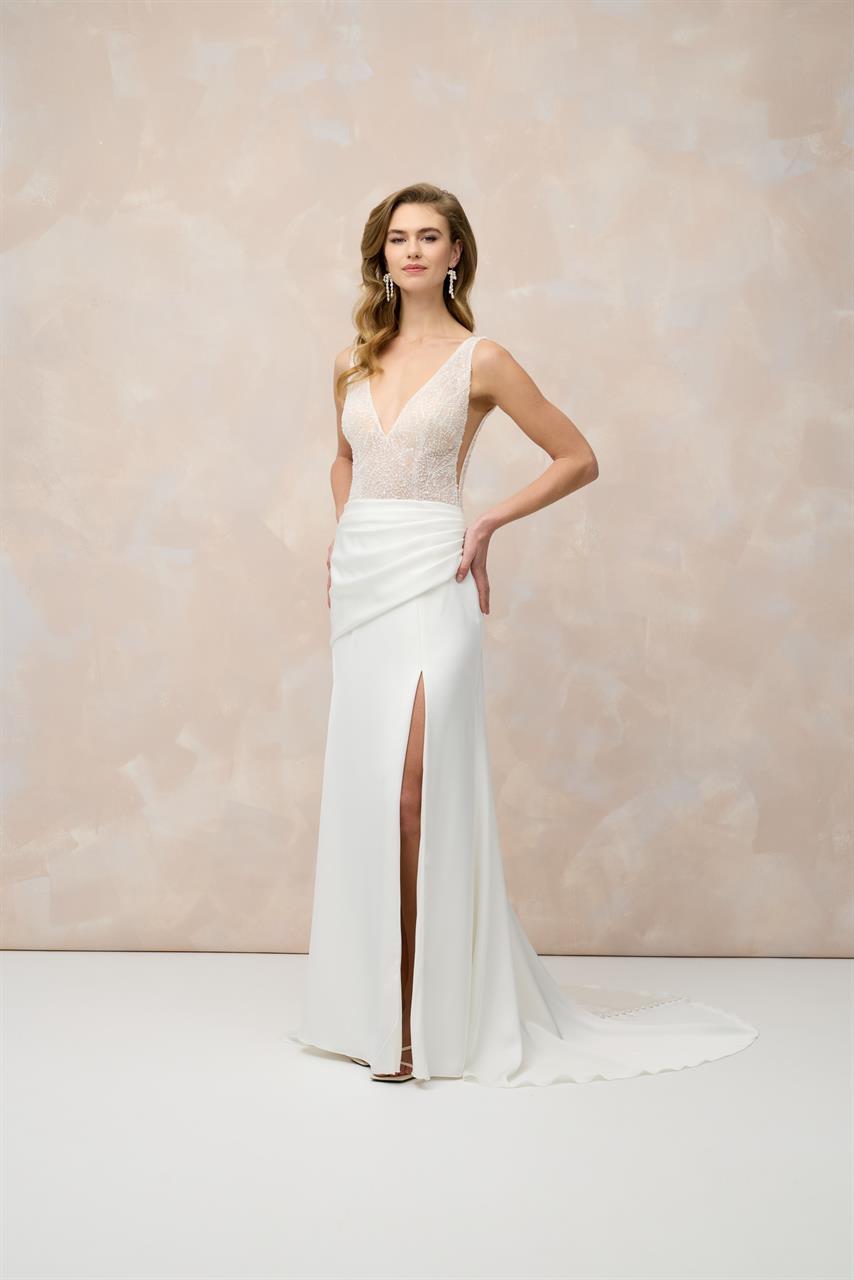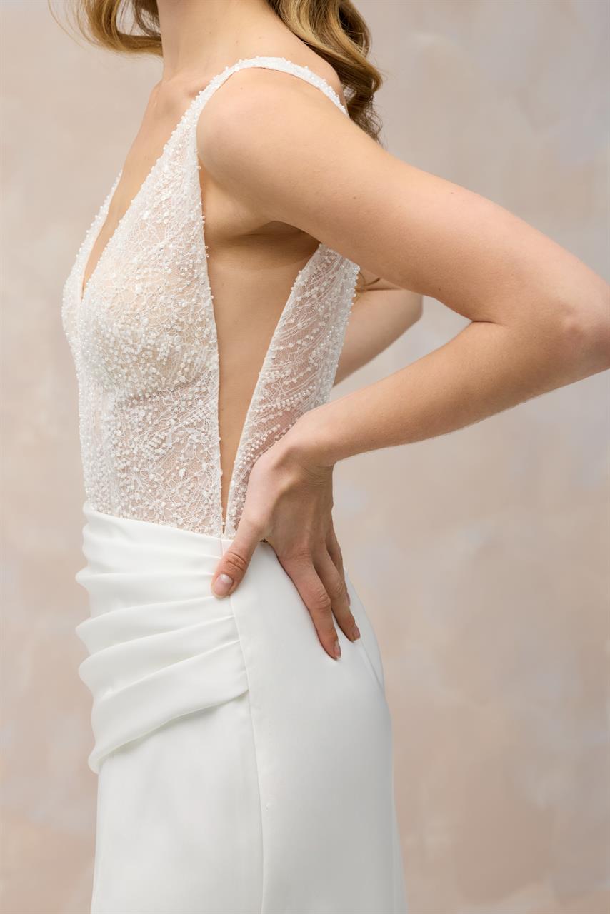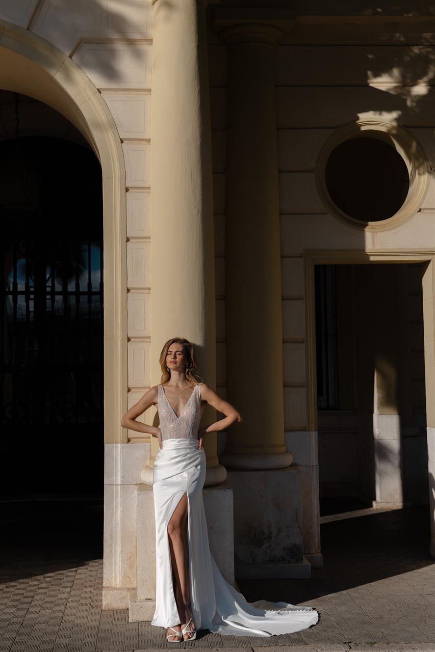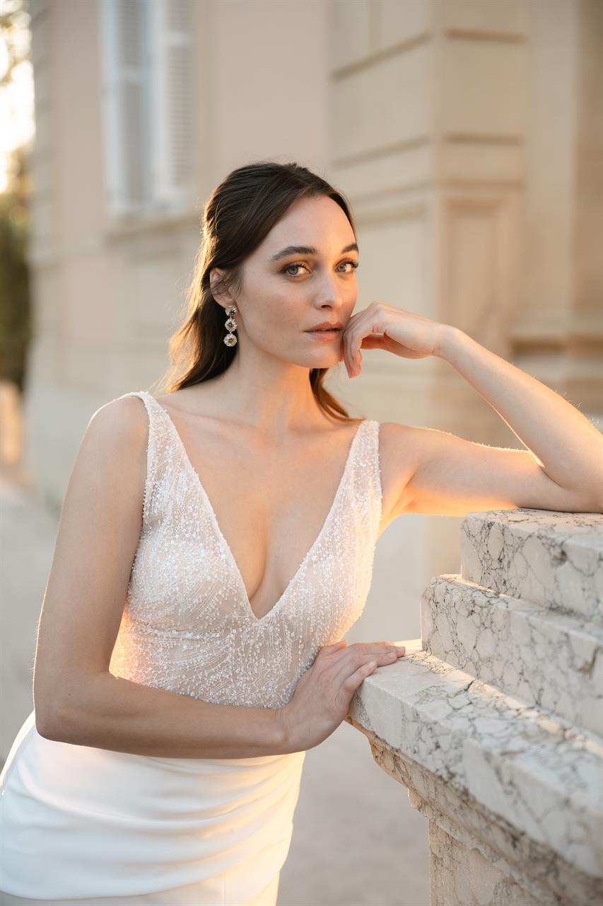 Dieses glamouröse Brautkleid ist wie geschaffen für Bräute, die selbstbewusst auftreten und Wert auf eine perfekte Balance zwischen klassischer Eleganz und moderner Leichtigkeit legen.