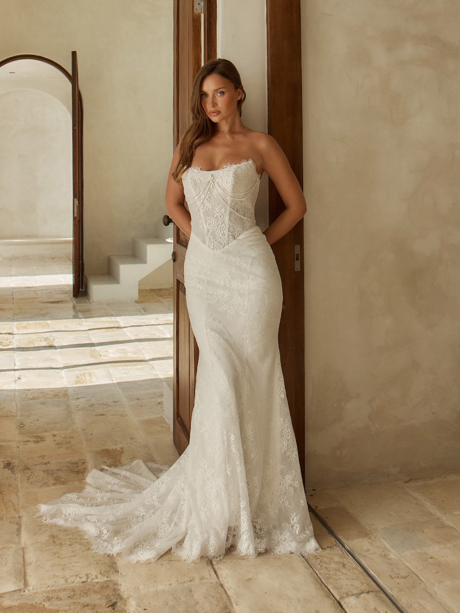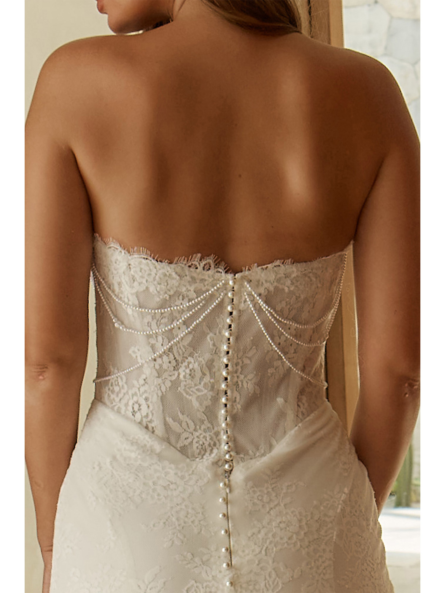 Der tiefe Rücken wird zu einem besonderen Blickfang. Eine elegante Perlenknopfleiste betont die feminine Rückenpartie und lässt das Brautkleid von hinten ebenso eindrucksvoll wirken wie von vorne. Die florale Spitze zieht sich harmonisch bis in die Schleppe und begleitet jeden Schritt mit fließender Leichtigkeit.