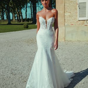 Dieses traumhafte Fit-and-Flare-Brautkleid in der edlen Farbgebung Ivory/Latte vereint moderne Eleganz mit zeitloser Raffinesse. Das Kleid ist ideal für Bräute, die einen schlichten, aber dennoch beeindruckenden Look für ihren großen Tag suchen. Es bietet eine klare, elegante Silhouette, die die Kurven perfekt betont und gleichzeitig eine unaufdringliche, feminine Ausstrahlung hat.