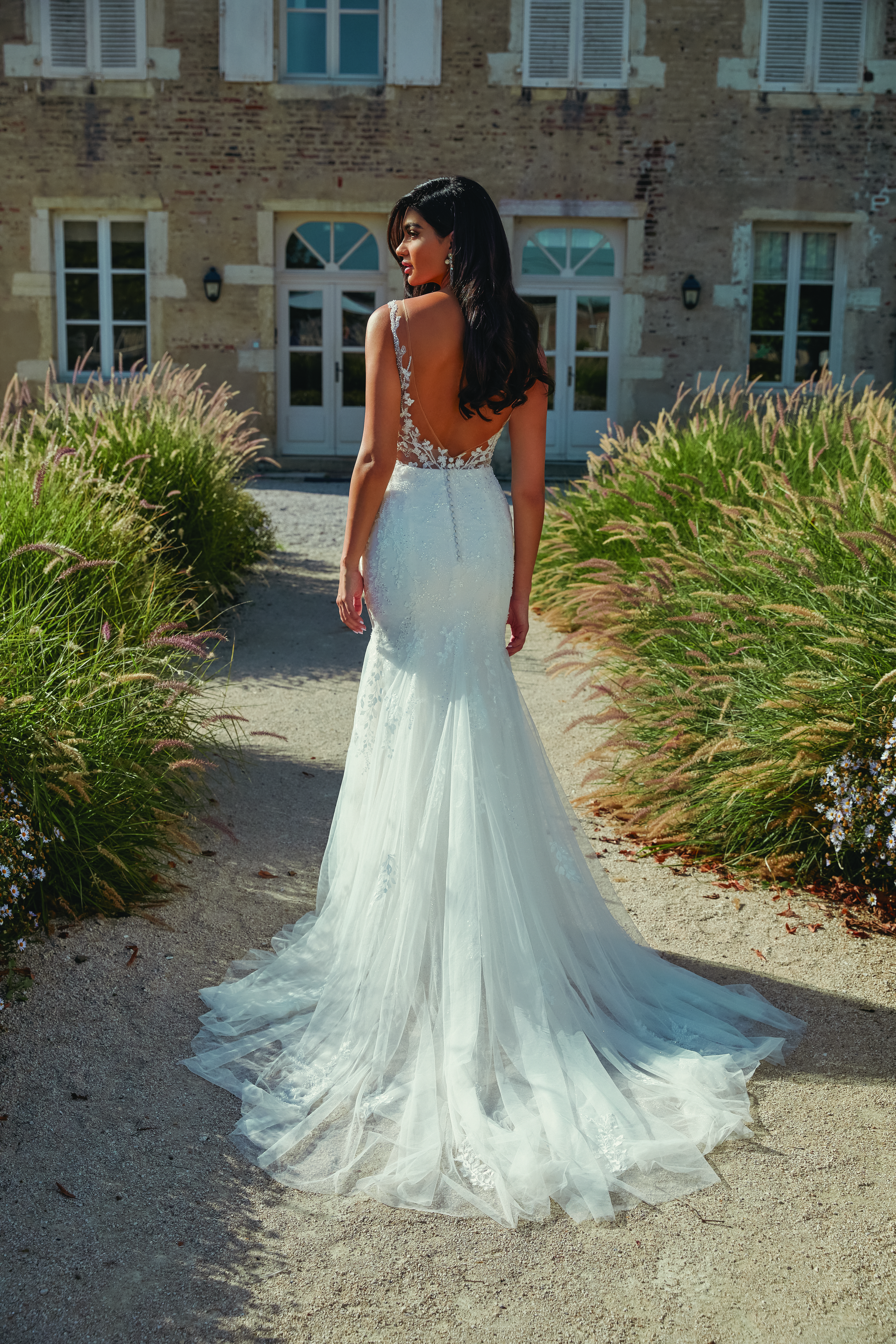 Die Fit-and-Flare-Silhouette akzentuiert die Taille und Hüften, bevor der Rock ab den Oberschenkeln in eine fließende, leicht ausgestellte Form übergeht. Diese Silhouette ist perfekt für Bräute, die ihre Figur gekonnt in Szene setzen möchten, ohne auf Komfort zu verzichten. Der weiche Jersey-Stoff sorgt für eine flexible Passform und gewährleistet, dass Du Dich den ganzen Tag über wohlfühlst. Der Rock besteht aus mehreren Lagen feinstem Tüll, der sanft über den Boden fließt und dem Kleid eine zarte, romantische Bewegung verleiht.