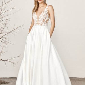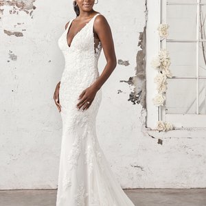 Entdecke die unvergleichliche Schönheit unseres Spitzenkleides in Fit und Flare. Der tief ausgeschnittene V-Ausschnitt und die seitlichen Cut-Outs mit Spitze verziert, führen zu einem transparenten V-Rücken und setzen deinen Rücken gekonnt in Szene. Die zarte Chantilly-Spitze und die funkelnden Paillettenapplikationen erstrecken sich über das gesamte Kleid, verleihen ihm eine bezaubernde Eleganz. Die durchsichtige Schleppe, das sanfte Jersey-Futter und die dezenten Knöpfe auf der Rückseite vollenden diesen Look und machen ihn einfach perfekt.