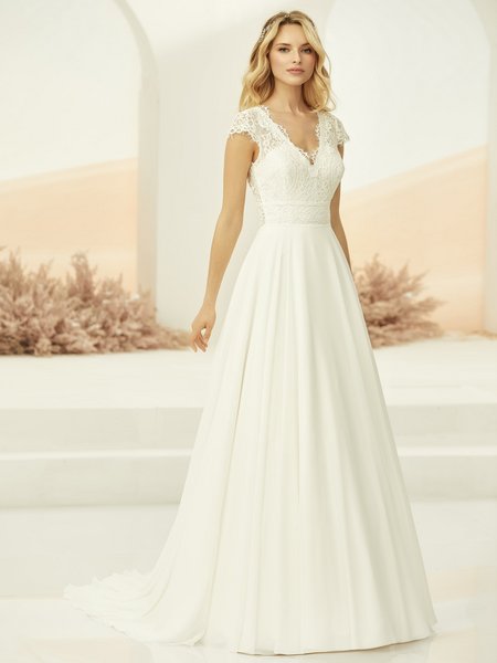 Erleben Sie die zarte Eleganz unseres fließenden A-Linien Brautkleids, das mit hochwertiger Spitze, einem Chiffon-Rock und einer bezaubernden Schleppe gefertigt ist. Dieses Kleid, erhältlich bei Cinderella Brautmode, vereint zeitlose Schönheit und modernen Charme, perfekt für die romantische Braut.