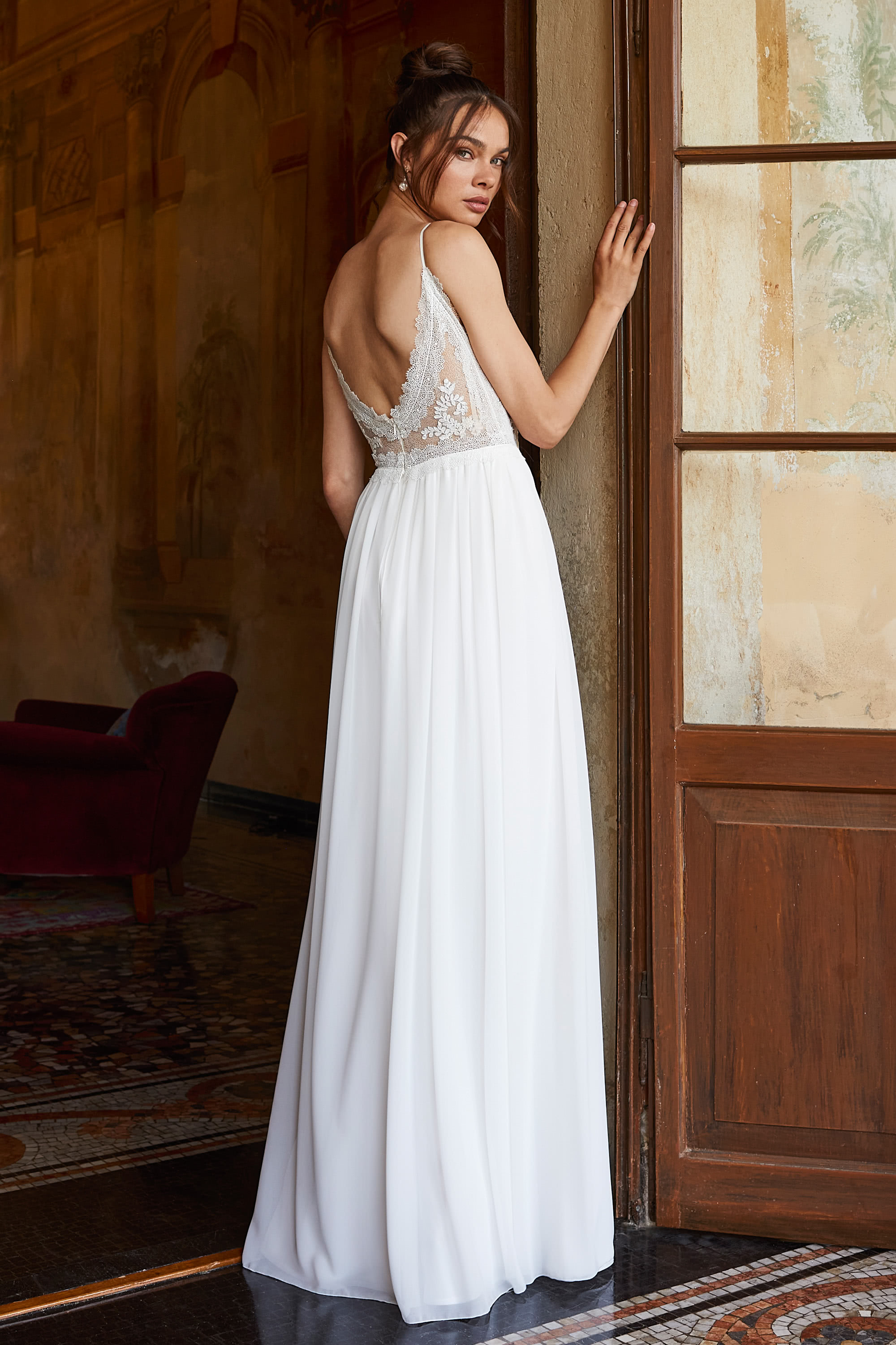 Ein Höhepunkt dieses Kleides ist der Taillengürtel, der den Übergang zum leichten Chiffonrock perfektioniert. Der Spitzenrand setzt sich hier fort und schafft einen harmonischen Übergang, der die Taille betont und deine Figur vorteilhaft umspielt. Durch die geschickte Raffung an der Taille entsteht ein sanfter, fließender Effekt, der diesem Kleid eine unvergleichliche Leichtigkeit verleiht.