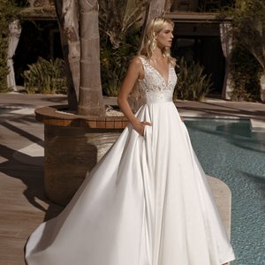 Finde Deine Magie in einer der femininen Silhouetten, die in der Modeca-Kollektion zu finden sind. Elegante Ballkleider, sexy Brautkleider mit ausgestellter Röcken und moderne A-Linien-Silhouetten. Sie präsentiert die exquisitesten Stoffe, von fließendem Chiffon über weite Mikado-Röcke bis hin zu zarter, durchscheinender Spitze.