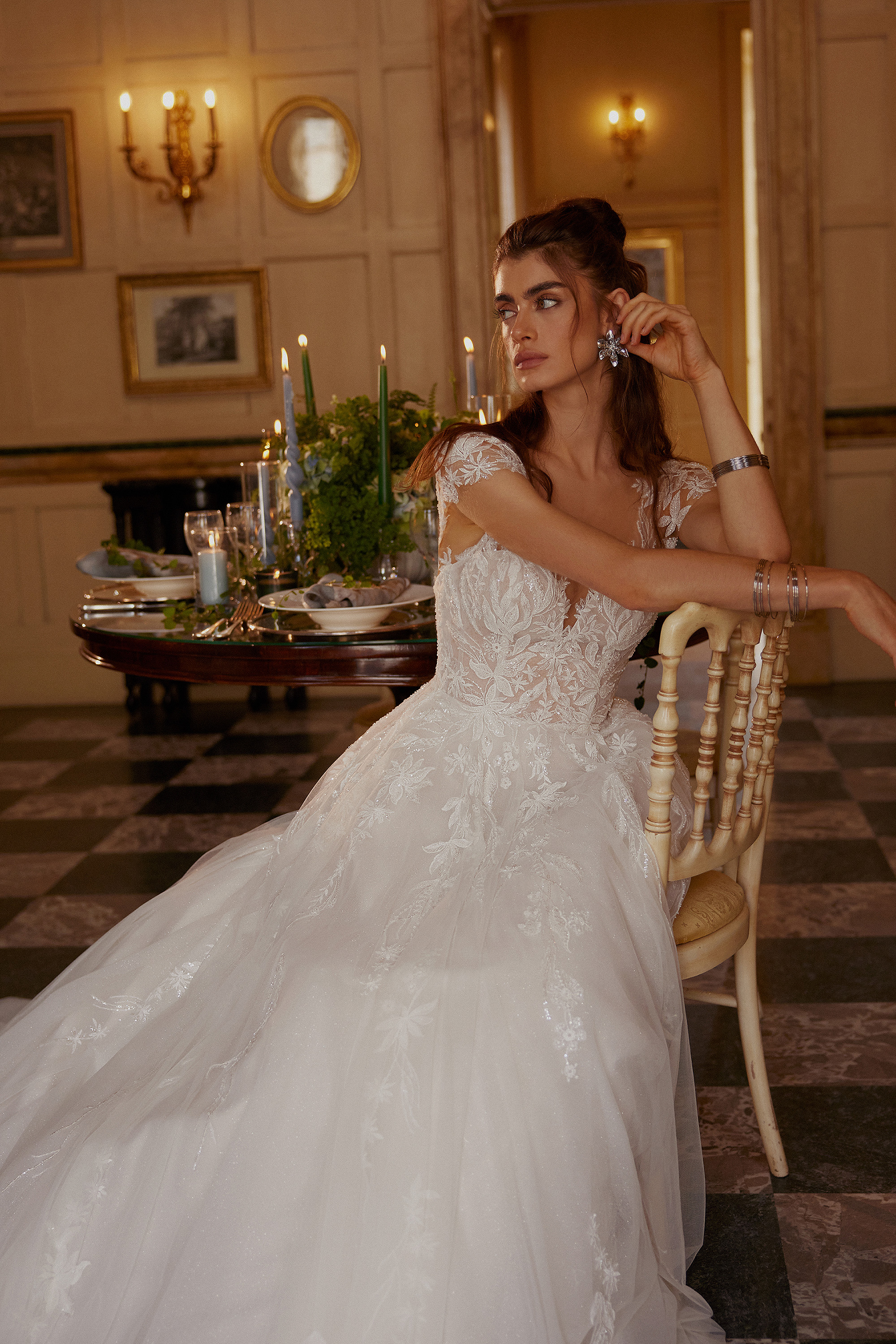 Das Oberteil besticht durch einen Illusionsausschnitt, der von zarter Vintage-Spitze und funkelnden Perlenverzierungen umrahmt wird. Die Cap-Ärmel verleihen dem Kleid eine dezente, feminine Note und unterstreichen den romantischen Stil des Designs. Der tiefe V-Rücken sorgt für eine sinnliche Rückansicht und fügt dem klassischen Look eine moderne und verführerische Note hinzu.