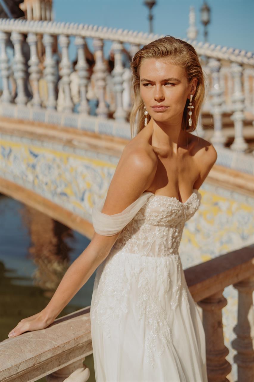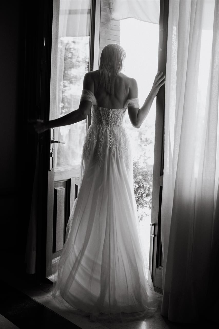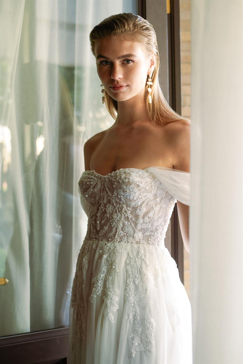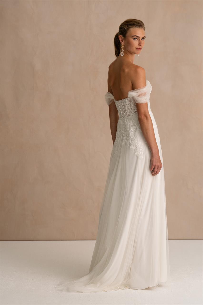 Dieses Kleid ist ideal für Bräute, die sowohl traditionelle Eleganz als auch moderne Romantik in ihrem Look vereinen möchten. Die Kombination aus handgefertigten Details, schulterfreien Ärmeln und einem fließenden Tüllrock macht dieses Kleid zu einer wahren Schönheit, die in jeder Location – ob Garten, Schloss oder festlicher Saal – strahlen wird.