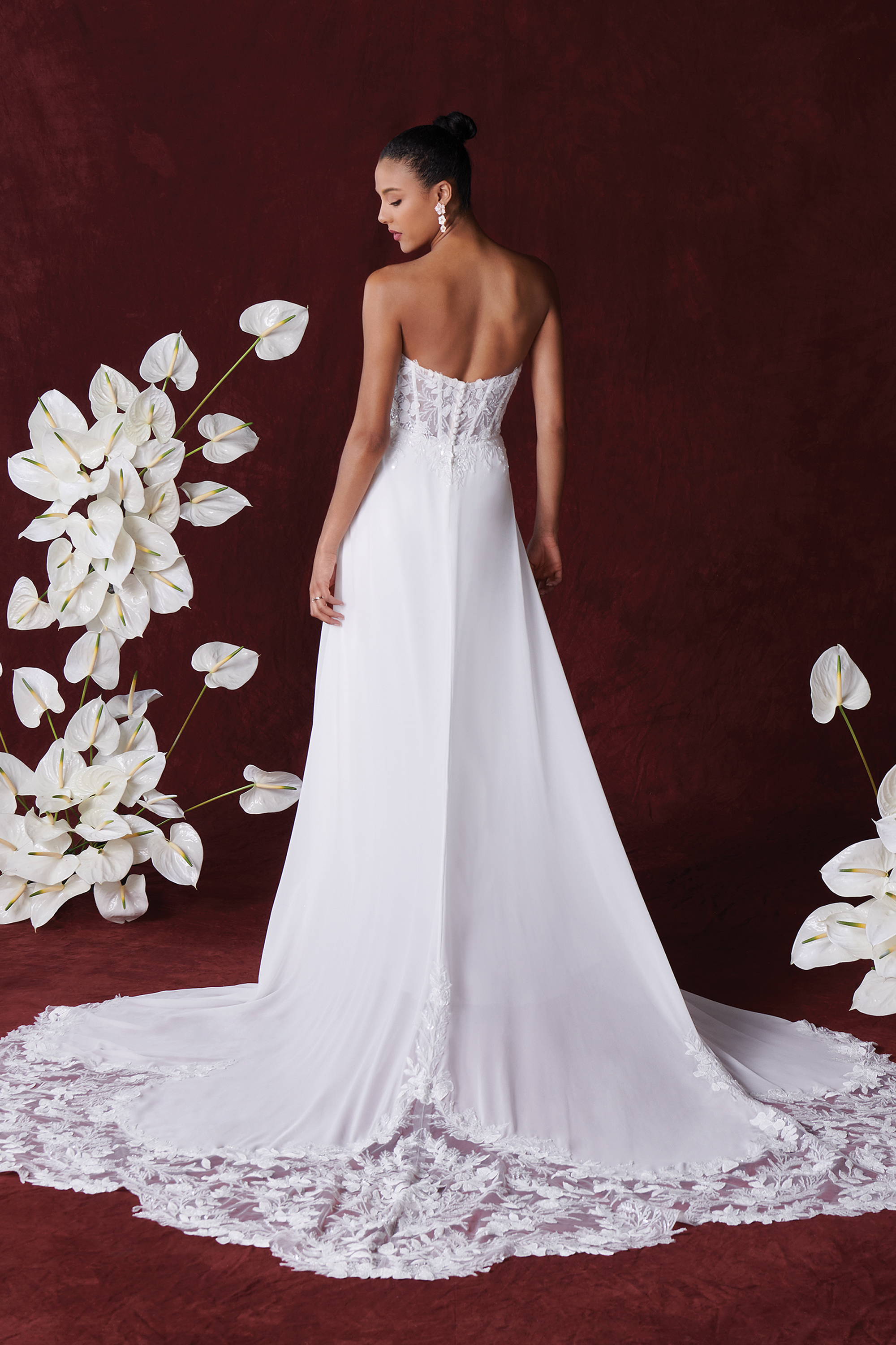 Das Brautkleid Holland entführt dich in eine Welt zeitloser Eleganz und modernen Stils. Dieses traumhafte, trägerlose A-Linien-Kleid aus zartem Chiffon schenkt dir nicht nur ein unvergleichliches Tragegefühl, sondern auch einen zauberhaften Look, der alle Blicke auf dich ziehen wird. Das durchsichtige Oberteil mit seinem tiefen, herzförmigen Ausschnitt setzt deine feminine Schönheit gekonnt in Szene und verleiht dem Kleid eine romantische Note, die dich strahlen lässt. Die freiliegenden Korsett-Stäbchen und die liebevoll gestalteten Demi-Cup-Nähte betonen deinen Ausschnitt auf eine zauberhafte Weise und verleihen dir ein unwiderstehliches Aussehen.