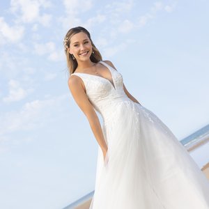 Durch den leichten Chiffonstoff bleibt das Kleid angenehm zu tragen, ohne an Eleganz zu verlieren. Der Trapezschnitt bietet eine schmeichelhafte Passform für jede Figur und sorgt für eine harmonische Silhouette. Dieses Kleid ist ideal für Bräute, die eine Kombination aus Romantik und schlichter Eleganz suchen und sich an ihrem großen Tag in einem Kleid bewegen möchten, das sowohl bequem als auch stilvoll ist.