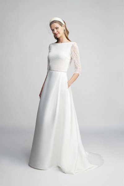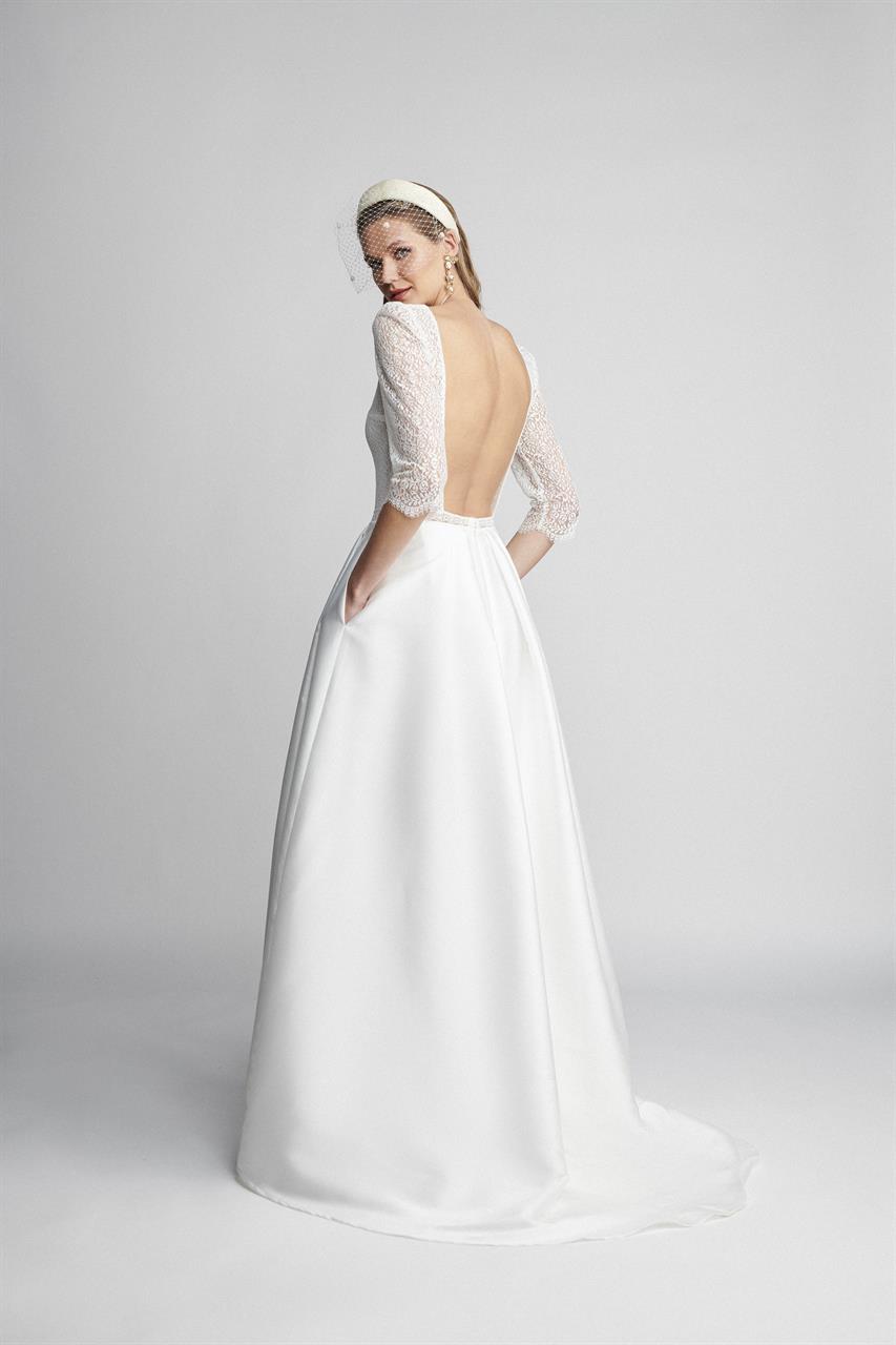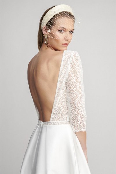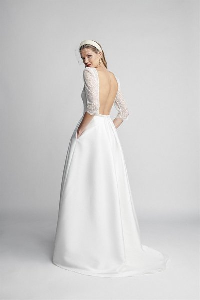 Diese Brautkleid bietet dir pure klassische Eleganz modern interpretiert. Die feine Spitze und der Mikado-Stoff im Rock machen es besonders edel. Vorne hochgeschlossen mit zarten Dreiviertelärmeln ist der Rücken hier das Highlight des Kleides, der er sehr tief und offen gestaltet ist.