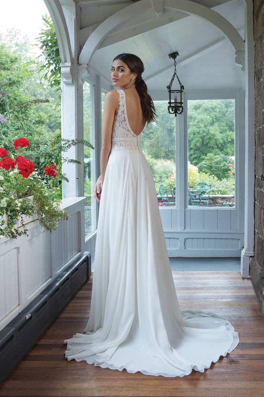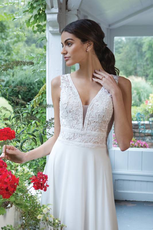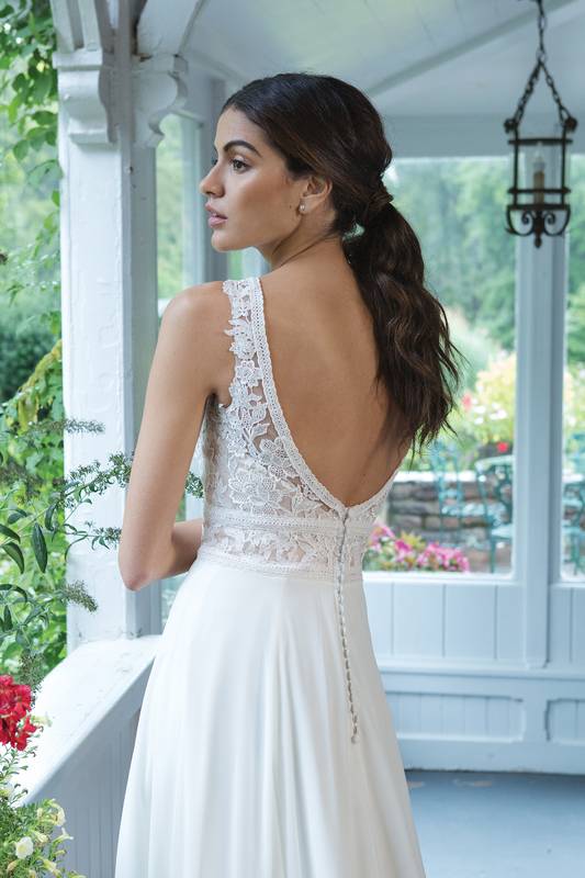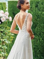 Das A-Linien-Kleid mit einem tiefen V-Ausschnitt und einem fließenden Chiffonrock ist eine exquisite Wahl für Bräute, die einen schlanken und anmutigen Look suchen. Dieses elegante Design kombiniert Einfachheit und Raffinesse, was es zur perfekten Wahl für den großen Tag macht.