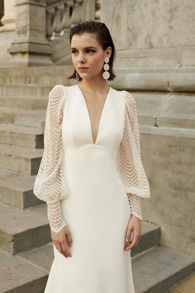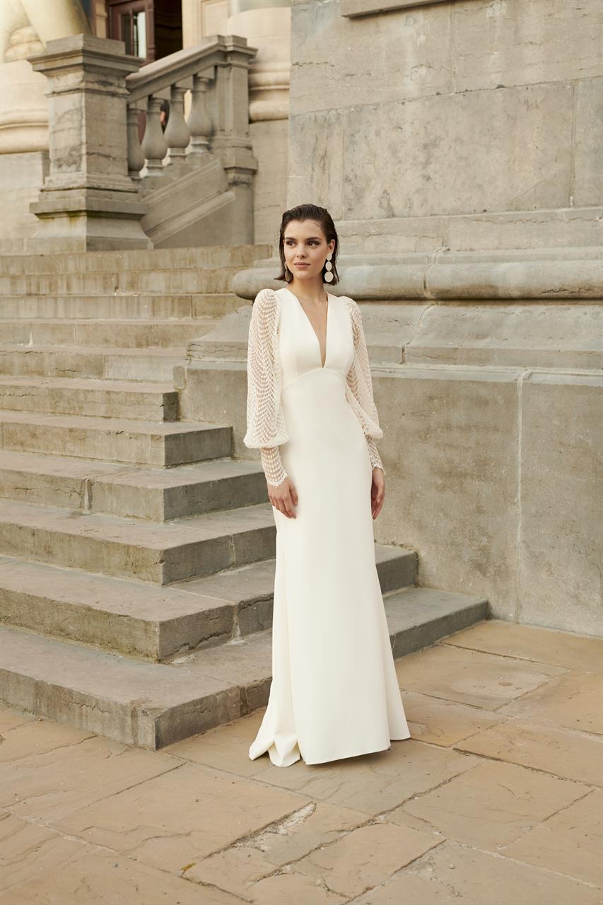 Das Jackson Brautkleid ist ein langärmeliges Meisterwerk, das durch seinen leichten Fit-and-Flare-Stil aus Jersey eine faszinierende Eleganz ausstrahlt. Dieses Kleid vereint moderne Schnittführung mit klassischen Details und schafft so ein Ensemble, das sowohl verführerisch als auch raffiniert ist.