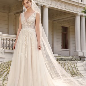 Das Taillenband des Kleides ist kunstvoll mit Perlen und Pailletten besetzt, wodurch ein traumhaft schöner Übergang zwischen dem Oberteil und dem weichen Tüllrock geschaffen wird. Die glitzernde Spitze verläuft elegant in die Mitte des Rockes, um schließlich in einer atemberaubenden Tüllschleppe zu enden.