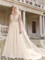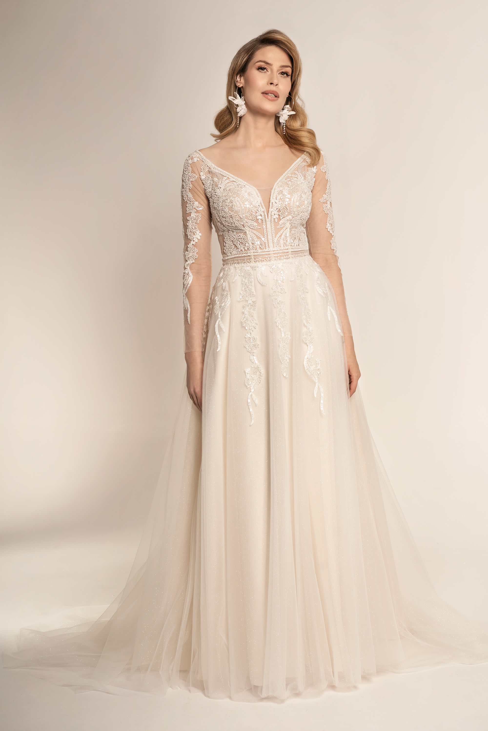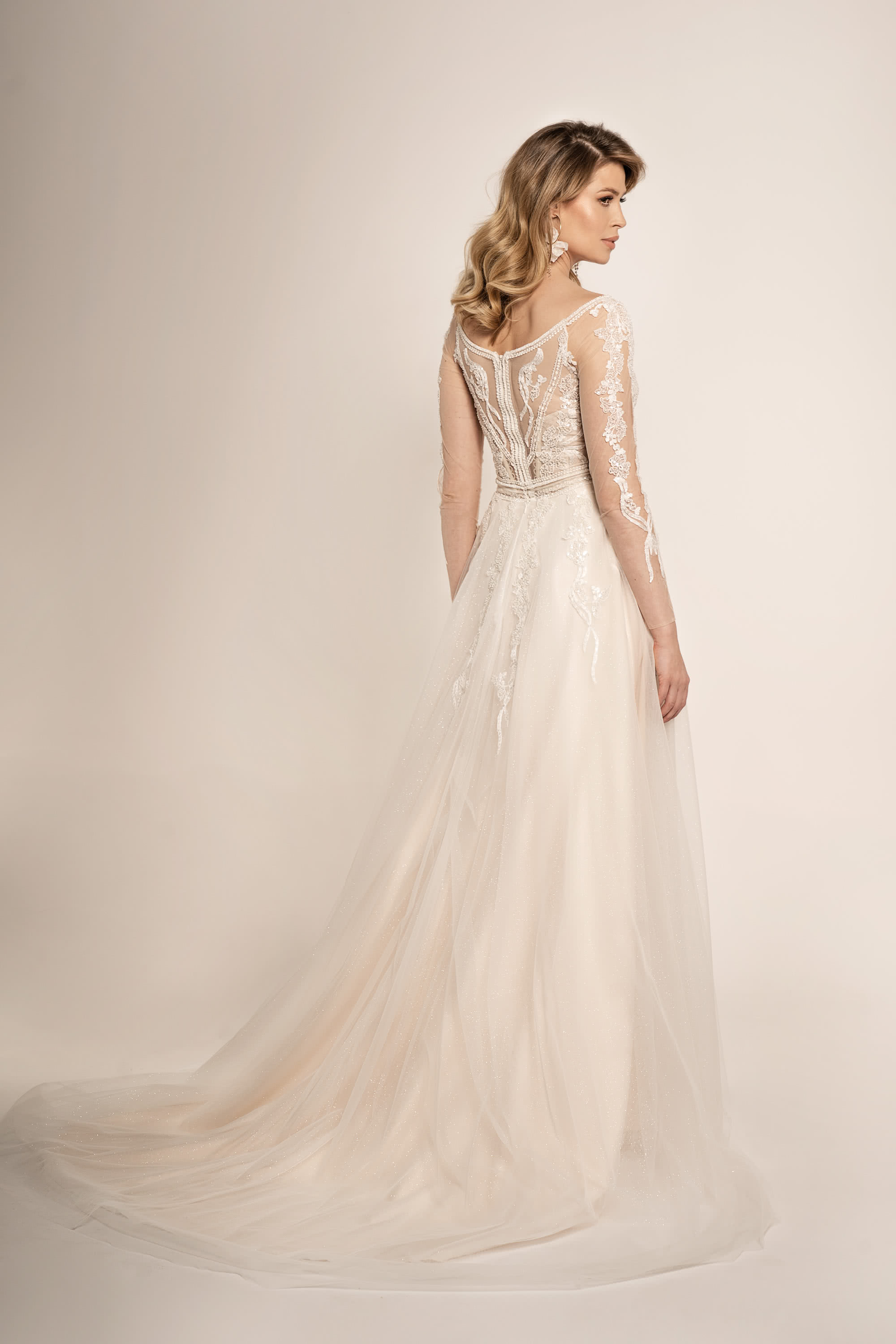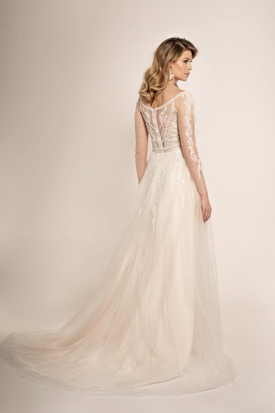 Das Taillenband des Kleides ist kunstvoll mit Perlen und Pailletten besetzt, wodurch ein traumhaft schöner Übergang zwischen dem Oberteil und dem weichen Tüllrock geschaffen wird. Die glitzernde Spitze verläuft elegant in die Mitte des Rockes, um schließlich in einer atemberaubenden Tüllschleppe zu enden.