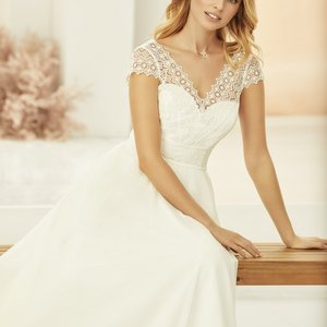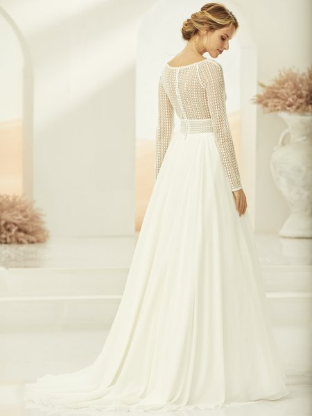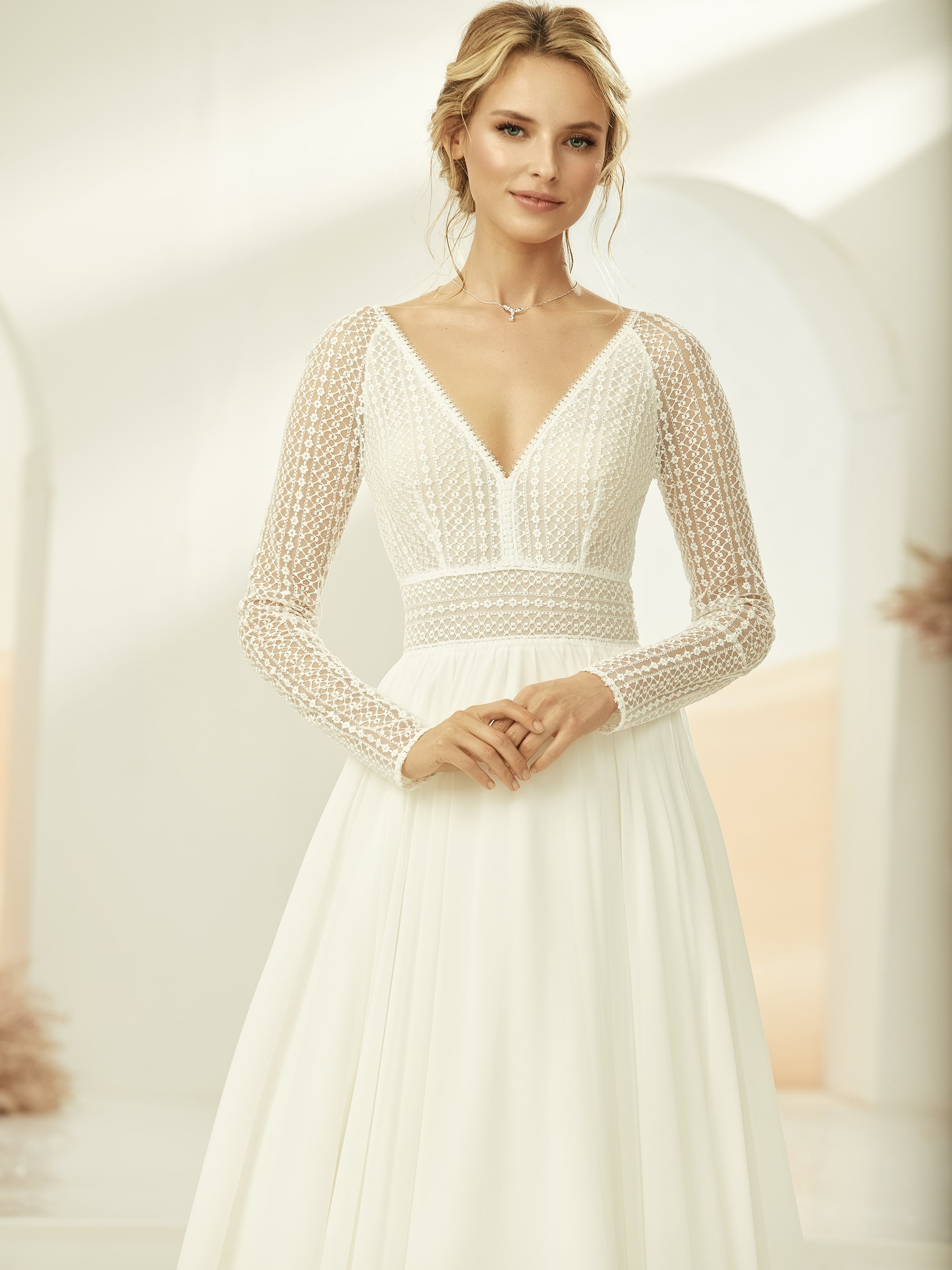 Tauchen Sie ein in die Welt der Eleganz mit unserem langärmligen Brautkleid aus hochwertiger Boho-Spitze und einem fließenden Chiffon-Rock, erhältlich bei Cinderella Brautmode. Dieses romantische Brautkleid vereint zeitlosen Stil und moderne Raffinesse.
