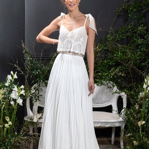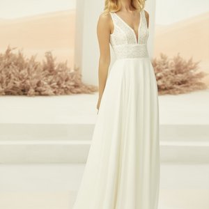 Der Übergang vom Spitzenoberteil in den üppigen Tüll-Rock ist nahtlos und fließend, wodurch das Kleid eine anmutige Silhouette erhält. Der opulente Rock, bestehend aus mehreren Schichten feinstem Tüll, sorgt für eine beeindruckende Fülle und Bewegung, die bei jedem Schritt für einen traumhaften Auftritt sorgt. Die Kombination von Tüll und Spitze macht dieses Kleid zu einem Inbegriff romantischer Brautmode.