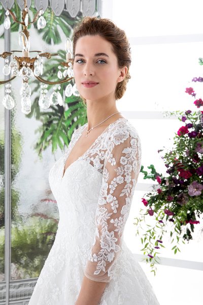Entdecke die majestätische Eleganz dieses langärmligen Brautkleides, das mit einer Kombination aus exquisiter Blüten-Spitze und einem opulenten Tüll-Rock wahrhaft königlich wirkt. Das Kleid verbindet romantische Details mit einem Hauch von Vintage-Charme, um die perfekte Balance zwischen zeitloser Schönheit und modernem Design zu schaffen.
