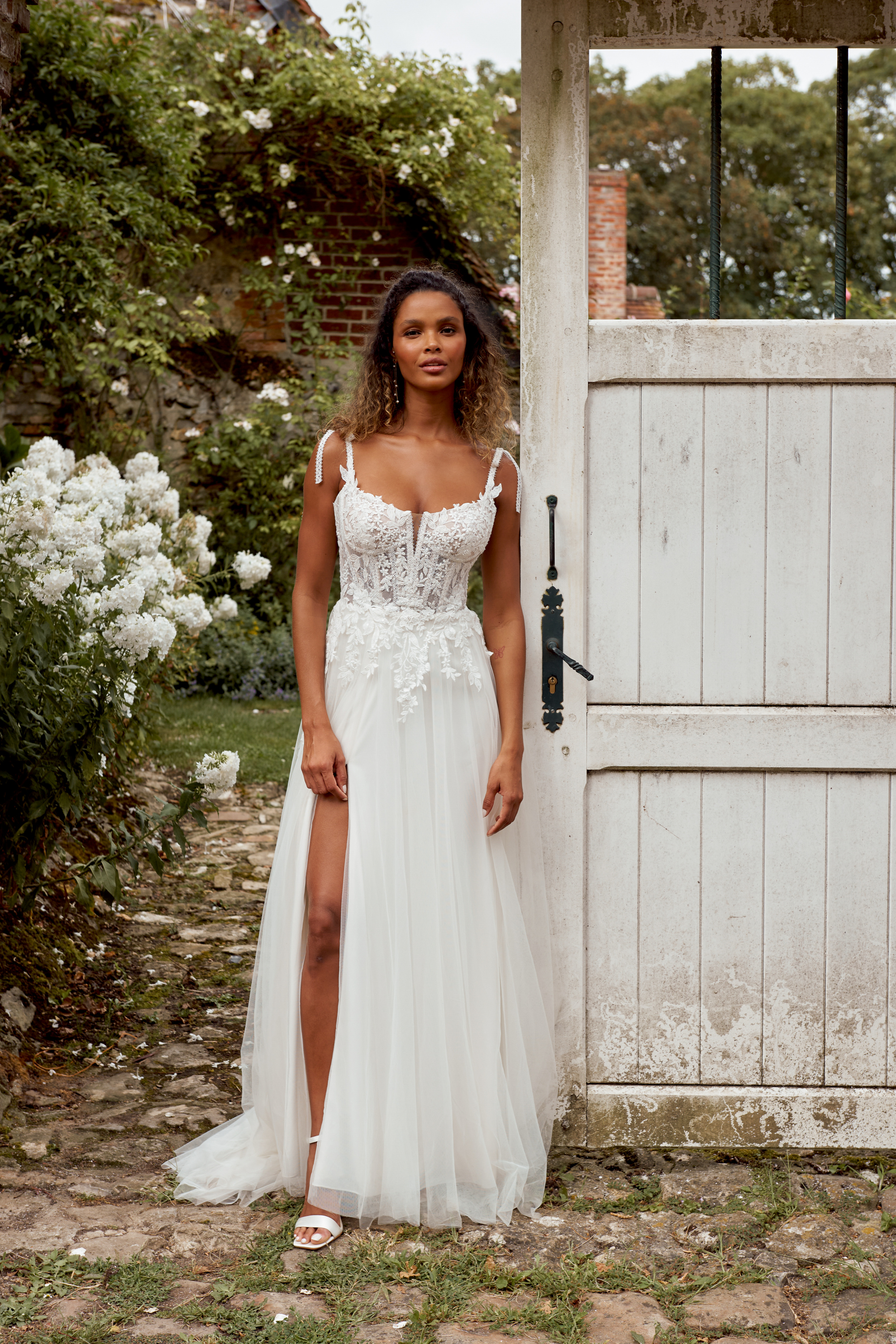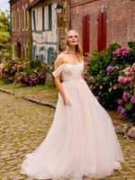 Ob im Garten, am Strand oder in einer eleganten Location: Dieses A-Linien Brautkleid passt sich deinem Stil an und lässt dich den ganzen Tag über strahlen. Die Kombination aus moderner Schnittführung, filigranen Spitzenapplikationen und dem luftigen Tüll macht dieses Brautkleid zu einem echten Lieblingslook.