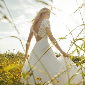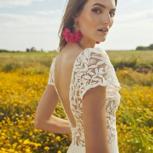 Mit dem Brautkleid Jean aus der neuen Kollektion 2024 von Rembo Styling wirst du dich wie eine echte Vintage-Schönheit fühlen. Das fließende, leichte Brautkleid aus Tüll und Chiffon besticht durch sein durchgehend besticktes Oberteil und seinen tiefen V-Ausschnitt sowie den verführerischen offenen Rücken. Die Vorderseite ist liebevoll mit einem elfenbeinfarbenen Futter versehen und zart mit transparentem Stoff akzentuiert. Der transparent gestaltete Rücken und die kurzen Ärmel sorgen für eine romantische Note. Ein besticktes, durchscheinendes Band betont sanft deine Taille und verleiht dem Kleid eine anmutige Silhouette. Der leichte Rock komplettiert das Bild und endet in einer dezenten Schleppe. Dieses atemberaubende Kleid wird dich an deinem Hochzeitstag erstrahlen lassen und jede Bewegung elegant begleiten. Vereinbare jetzt deinen Termin bei Cinderella Brautmode Köln und finde dein Traumkleid für deine freie Trauung oder Strandhochzeit!
