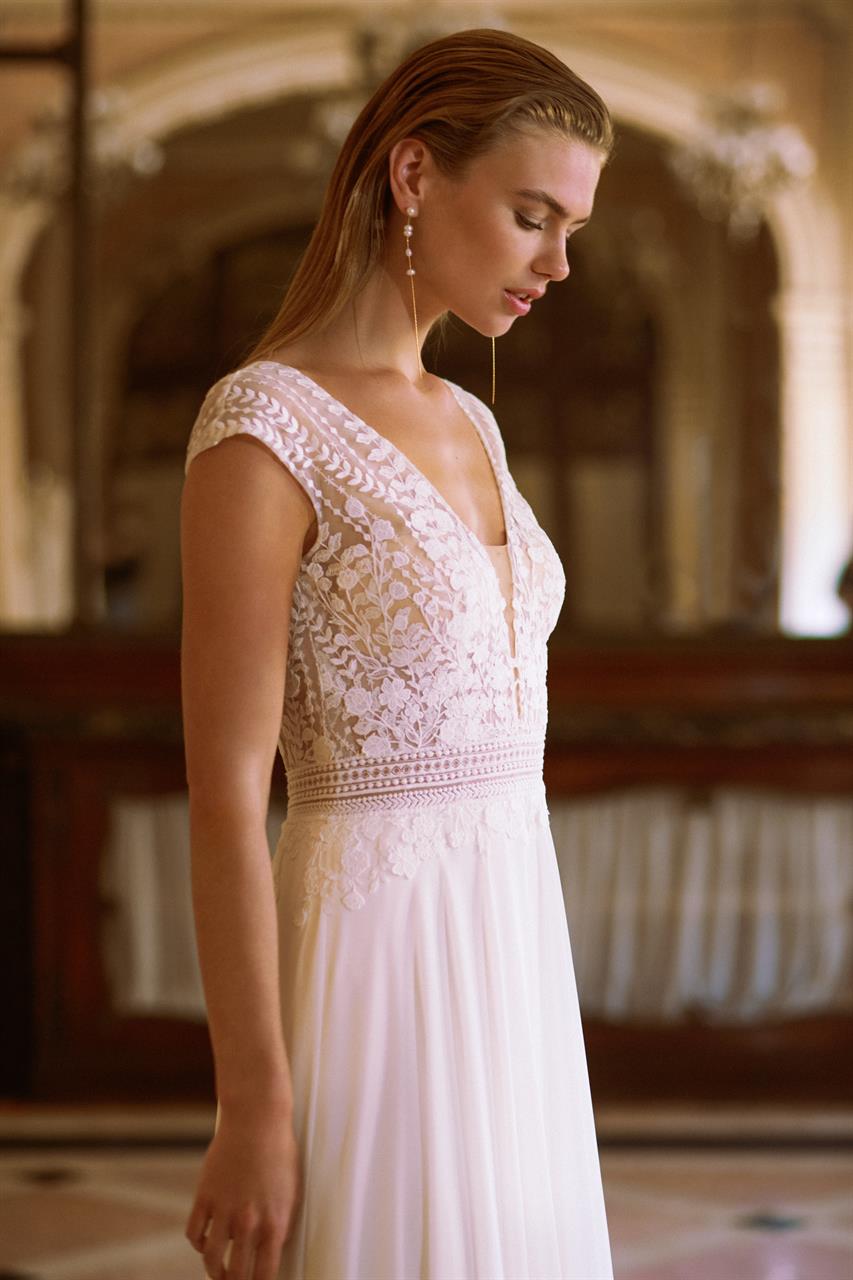 Dieses Brautkleid ist perfekt für Bräute, die sich eine Mischung aus romantischer Spitze und zartem Chiffon wünschen. Es vereint die Schönheit floraler Applikationen mit einer modernen, fließenden Silhouette und lässt Dich an Deinem großen Tag in jedem Moment strahlen.