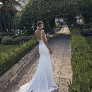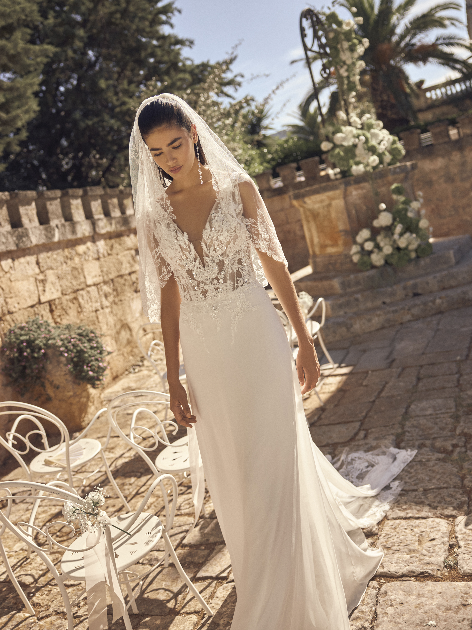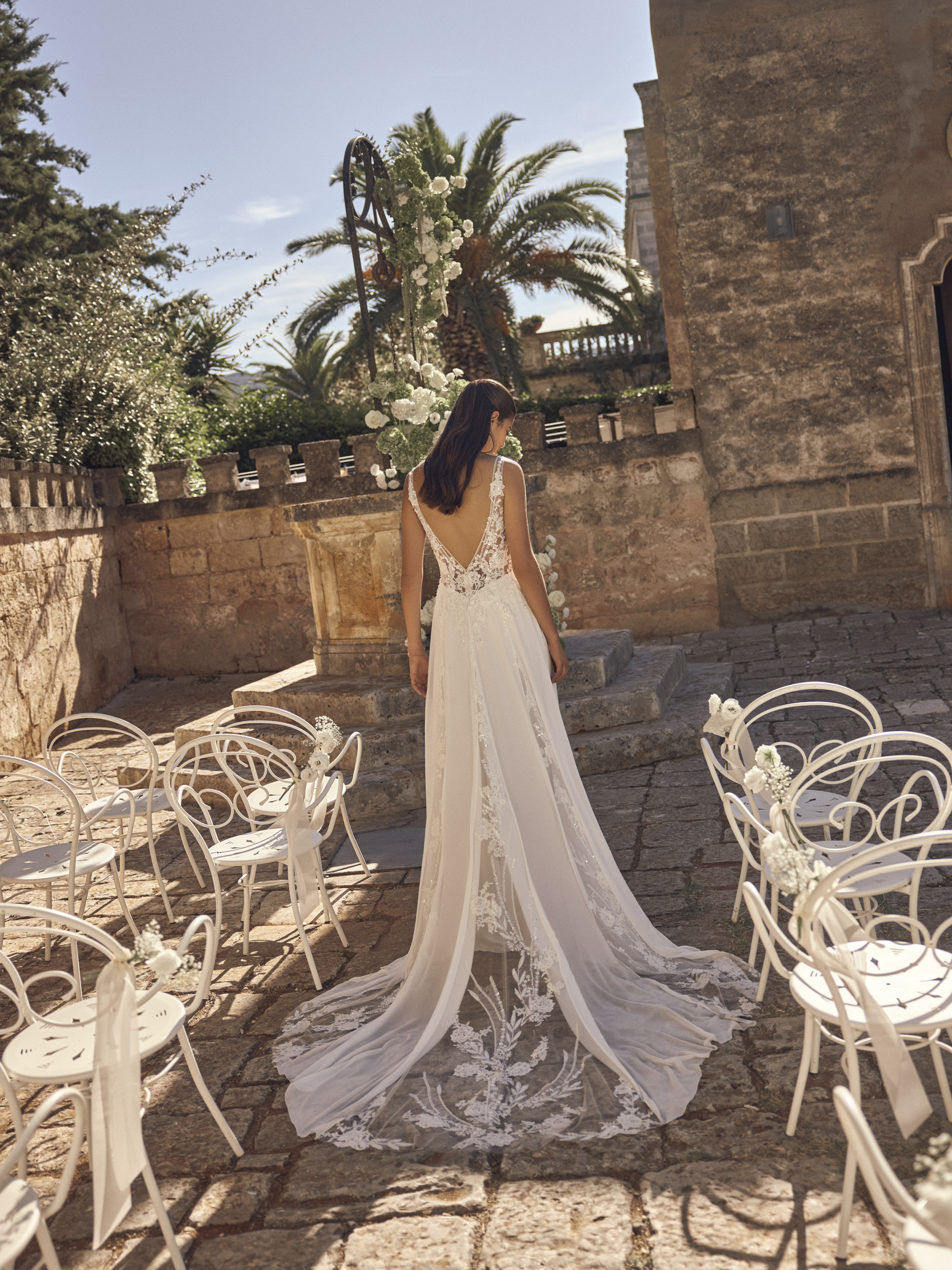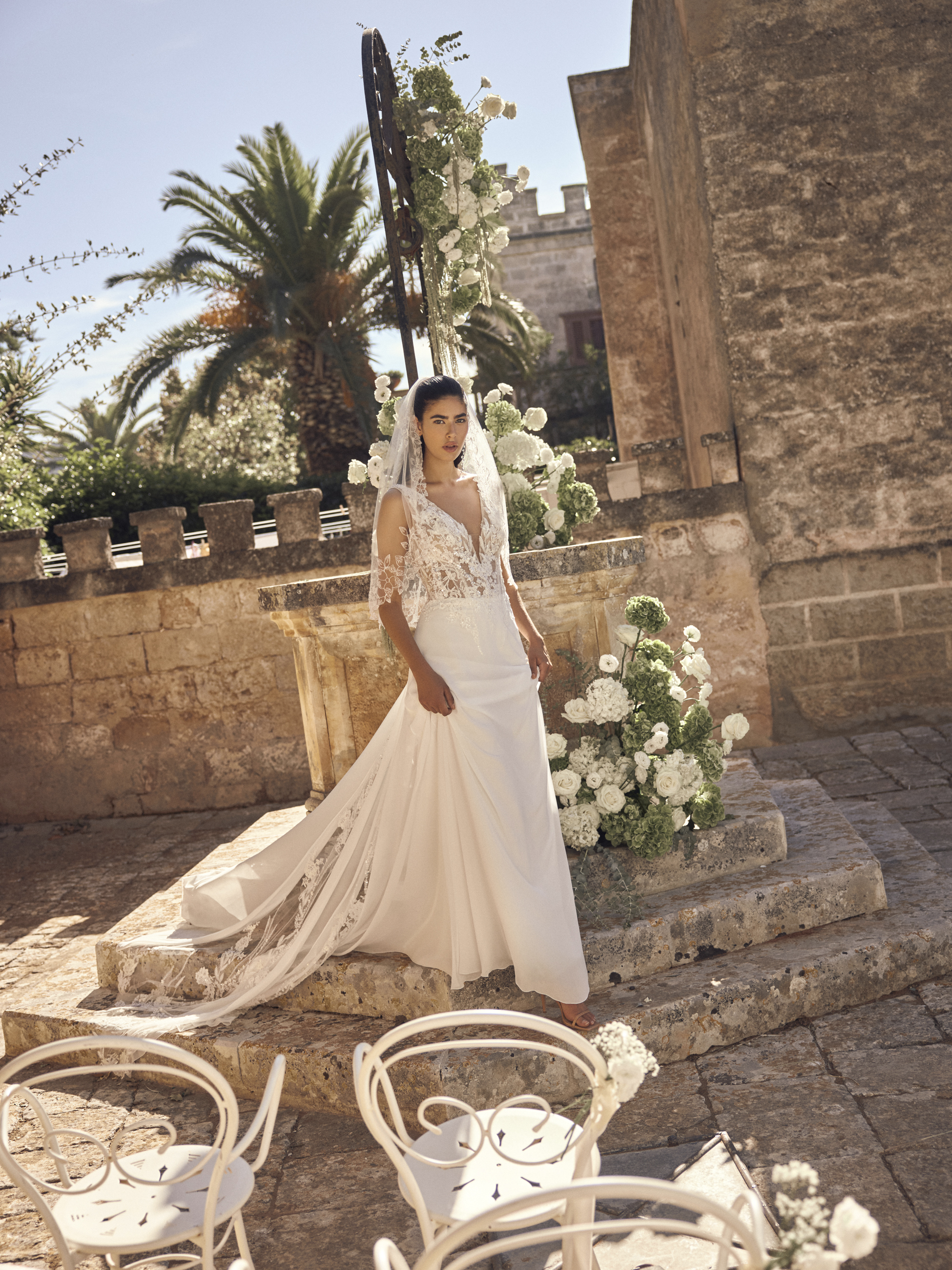 Der weich fallende Rock aus luftigem Chiffon bewegt sich traumhaft leicht und sorgt für eine elegante Ausstrahlung voller Natürlichkeit. Die filigrane Schleppe mit zarten Spitzenakzenten rundet den Look harmonisch ab und verleiht ihm romantischen Zauber.