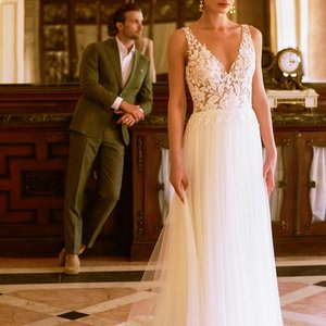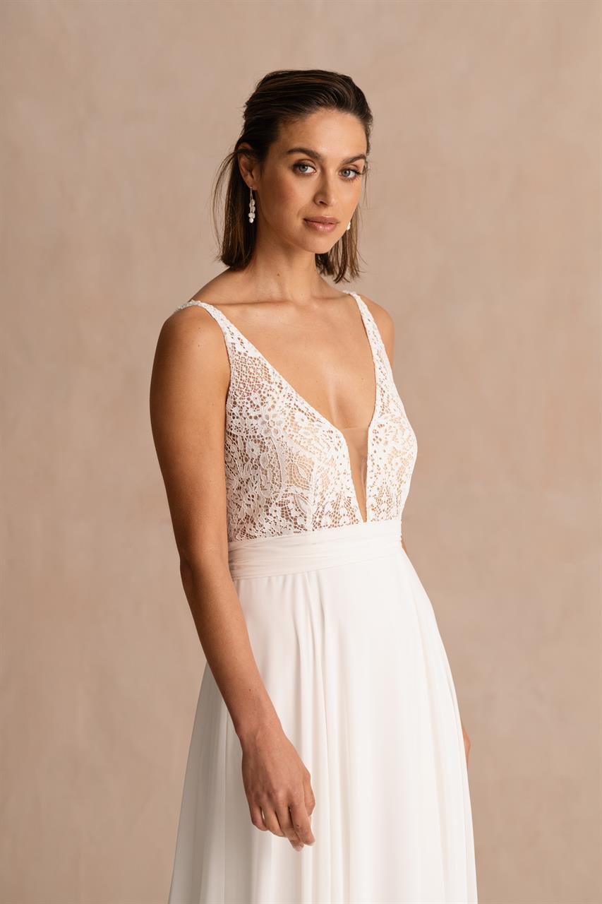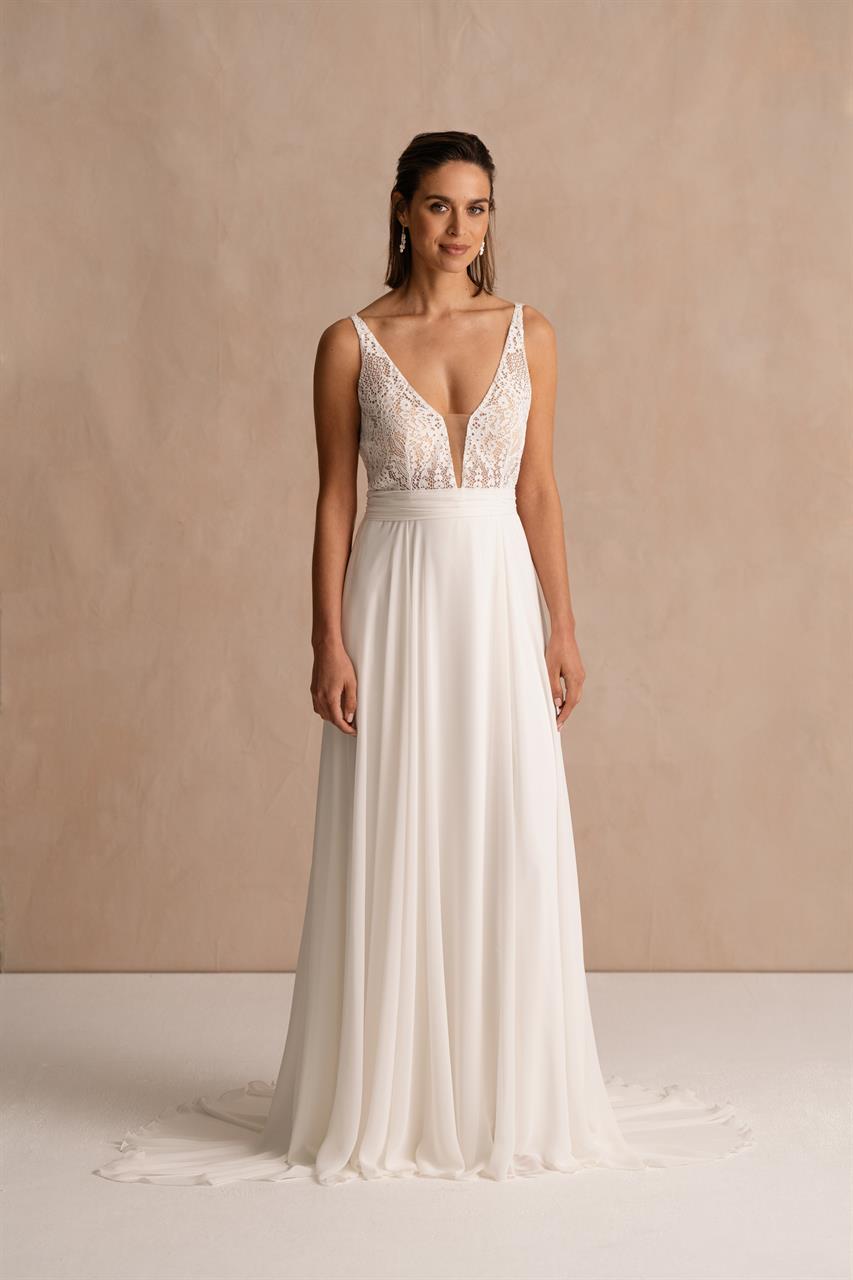 Dieses Brautkleid ist die ideale Wahl für Bräute, die nach einem romantischen und dennoch modernen Look suchen. Mit seiner Kombination aus zarter Spitze, fließendem Chiffon und funkelnden Details bietet es die perfekte Balance zwischen Eleganz und Lässigkeit. Es passt perfekt zu einer Sommerhochzeit im Freien, einer Strandzeremonie oder jeder Feier, bei der eine leichte, verträumte Atmosphäre gewünscht ist.