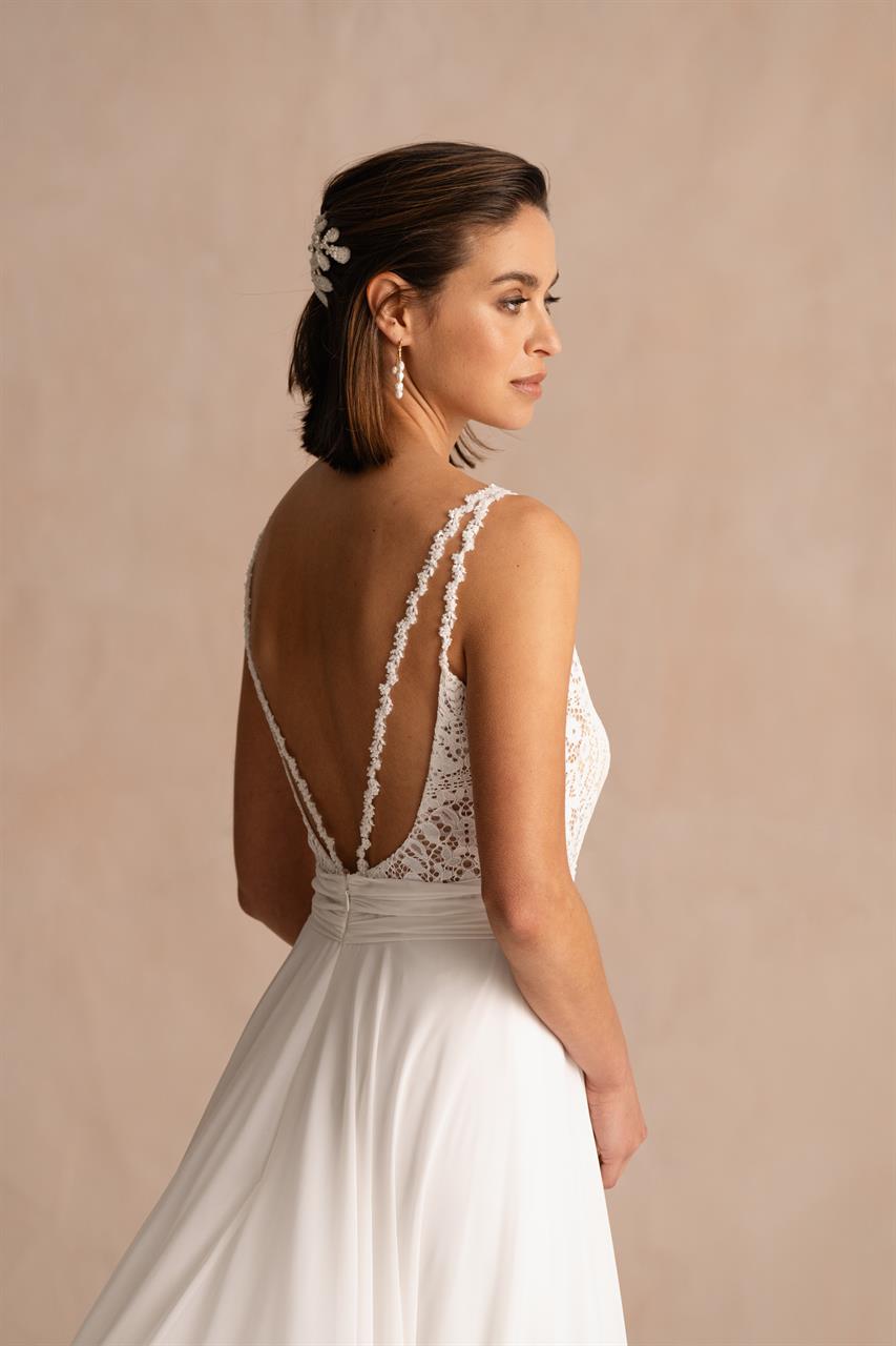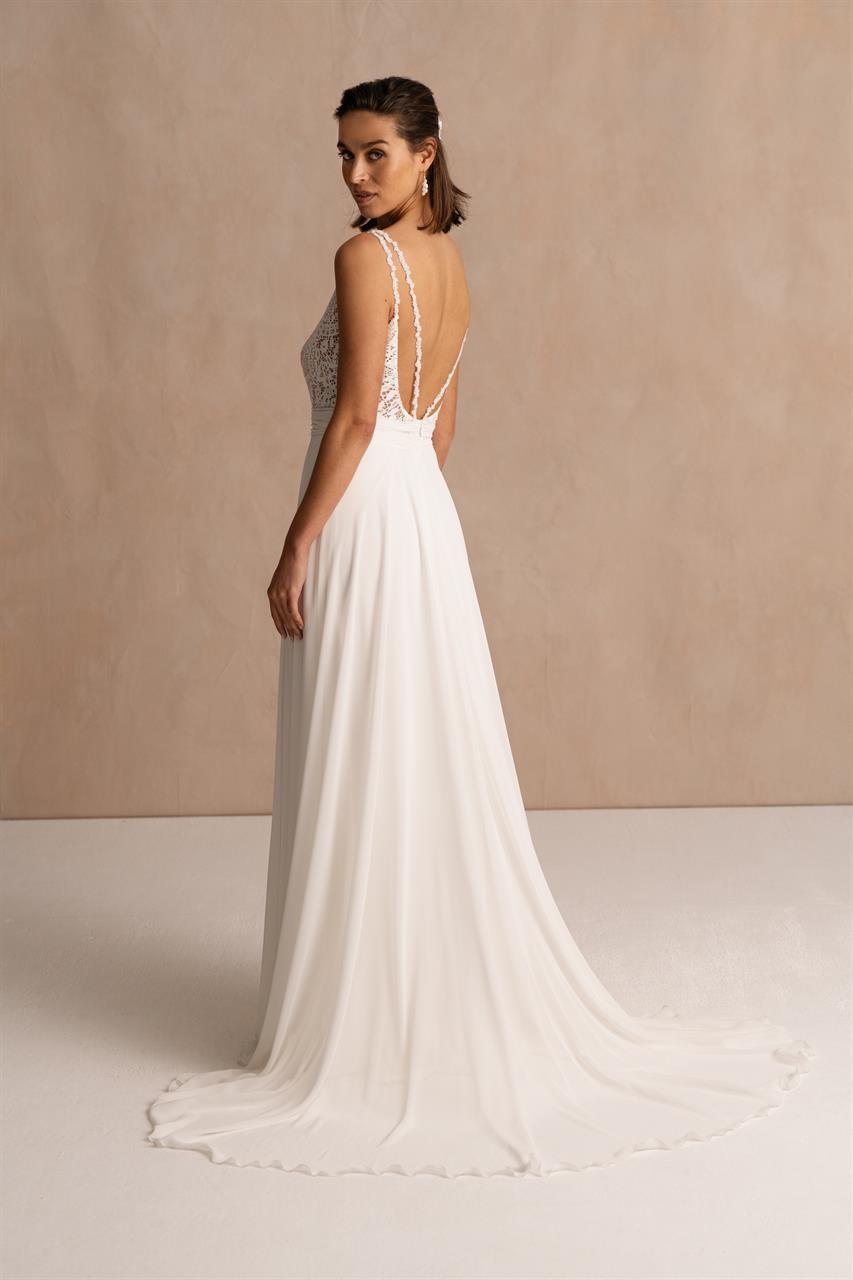 Dieses Brautkleid vereint Leichtigkeit und Romantik in einem stilvollen Design, das perfekt für Bräute ist, die von einem mühelosen, eleganten Look träumen. Der fließende Chiffonrock fällt sanft und umspielt die Figur, während die Hofschleppe dem Kleid einen Hauch von klassischer Eleganz verleiht. Dieses Kleid ist die ideale Wahl für Hochzeiten im Freien oder in einer natürlichen Umgebung, wo es durch seine zarte und luftige Ausstrahlung glänzen kann.