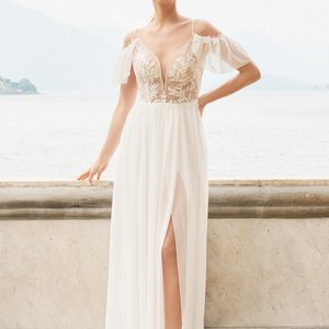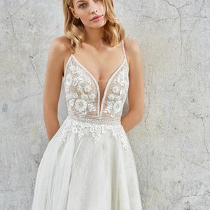 Dieses bezaubernde A-Linien Brautkleid verkörpert das Sinnbild von Leichtigkeit und Eleganz. Das Oberteil des Kleides ist kunstvoll mit Spitzenapplikationen versehen, die mit kleinen Perlen und Pailletten verziert sind und dadurch einen faszinierenden 3D-Effekt erzeugen.