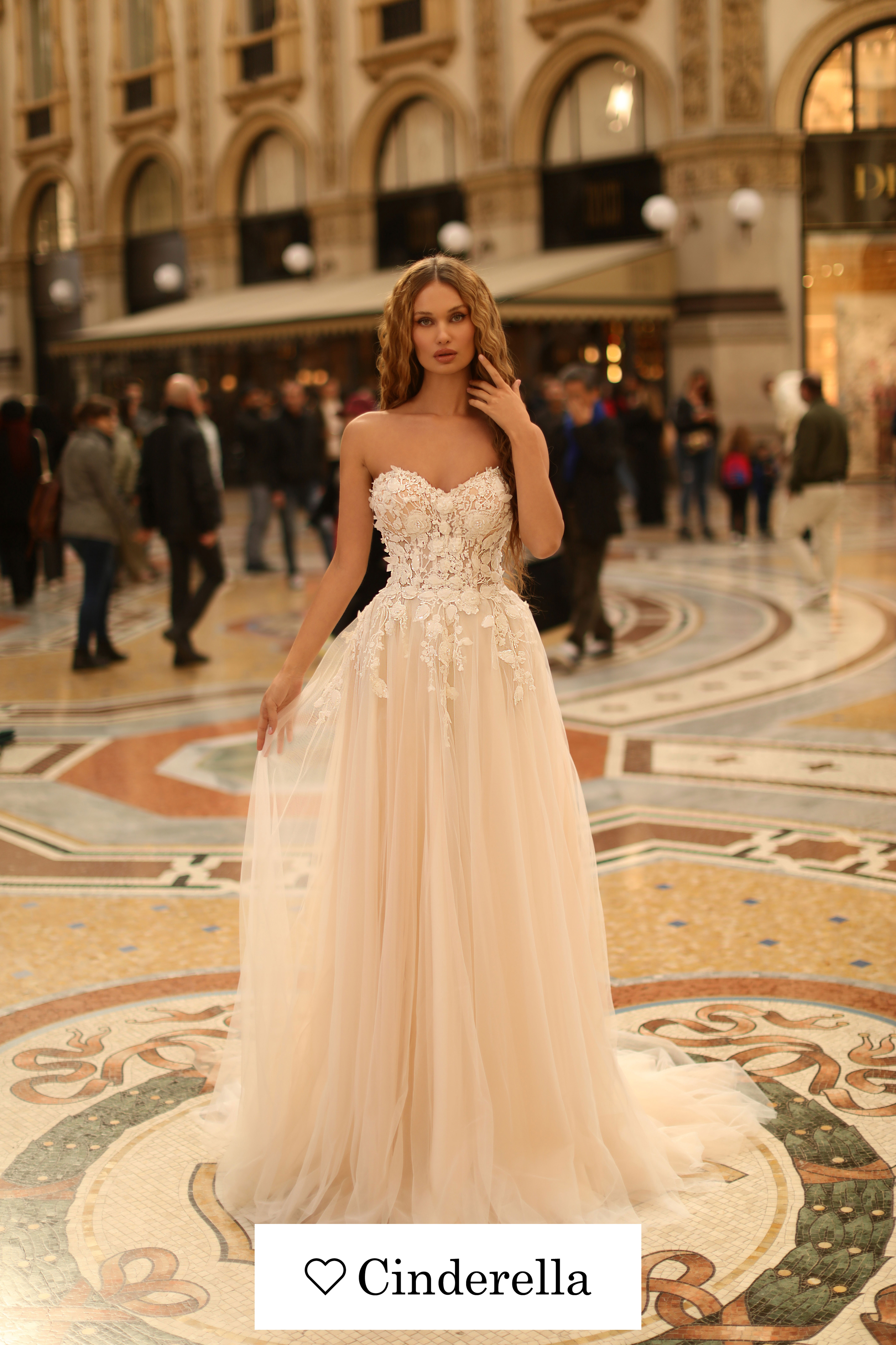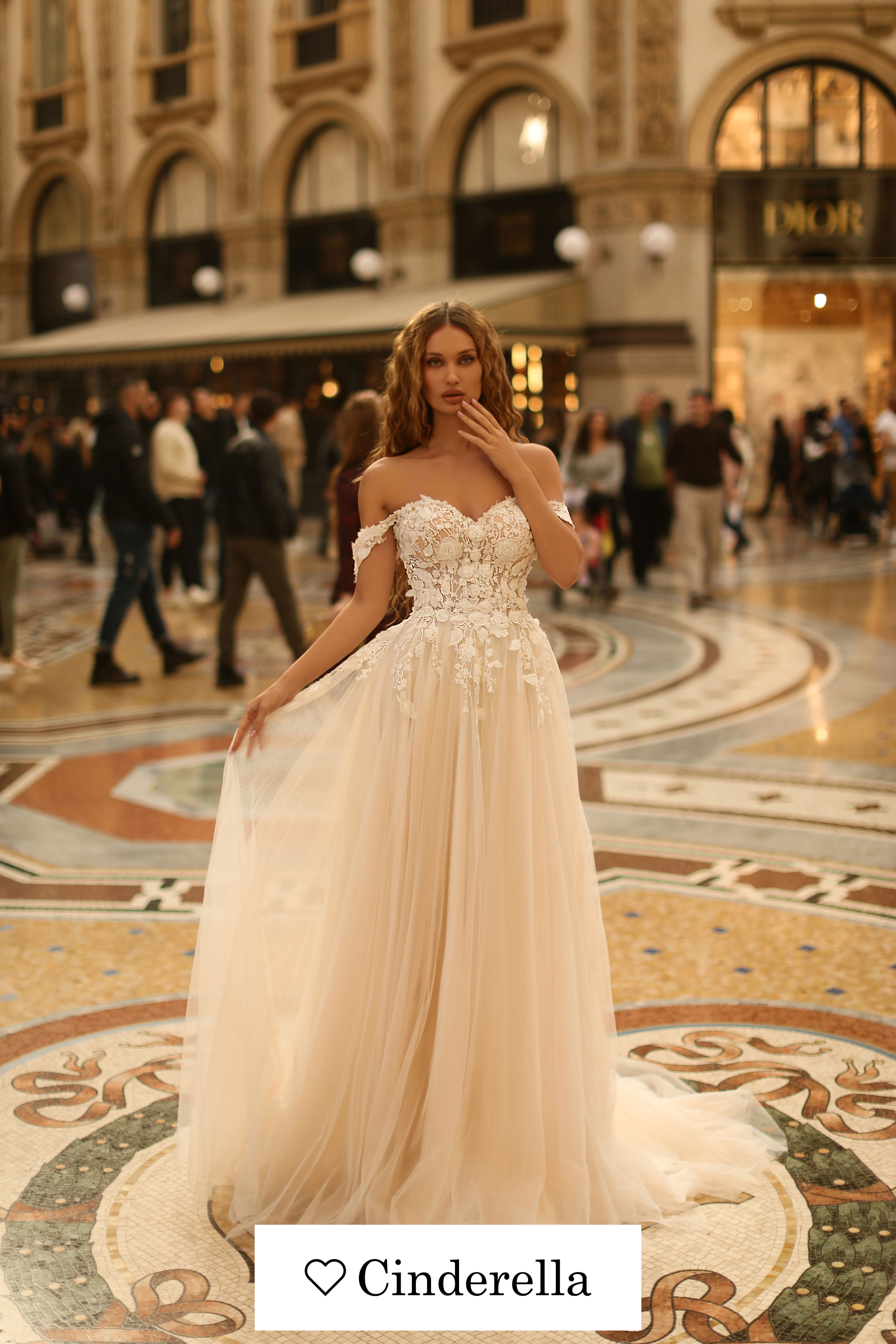 Ein Kleid für die Braut, die sich einen märchenhaften Look mit luxuriösen Details wünscht. Dieses Modell aus der Cinderella 2025 Kollektion begeistert mit einem schulterfreien Carmen-Ausschnitt, der die Schultern sanft umspielt und das Dekolleté elegant in Szene setzt. Die aufwendig gearbeitete 3D-Spitze verleiht dem Oberteil eine verspielte, romantische Optik und geht fließend in den luftigen Tüllrock über.