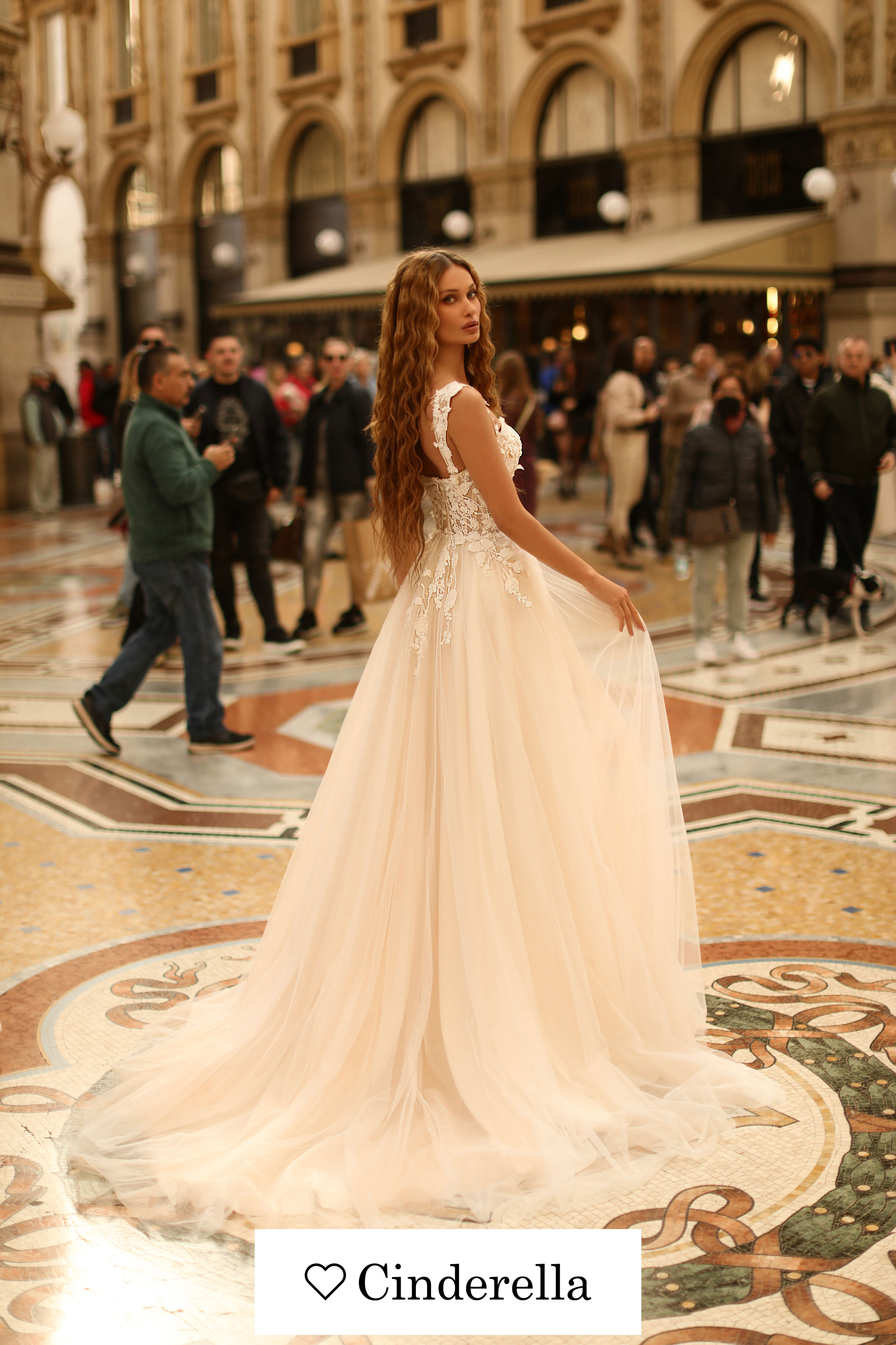 Der weich fallende A-Linien-Schnitt sorgt für einen traumhaften Look, während die lange Schleppe dem Kleid eine königliche Note verleiht. Die Kombination aus zarten Stoffen und aufwendiger Handarbeit macht dieses Modell zu einer perfekten Wahl für eine romantische Hochzeit – ob in einer Schlosskulisse oder unter freiem Himmel.