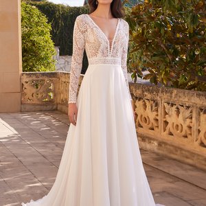 In diesem bezaubernden Fit und Flare Kleid aus zarter Chantilly-Spitze erwartet dich eine märchenhafte Erfahrung. Der tiefe V-Ausschnitt und die durchsichtigen Träger, die geschmeidig zum Illusionsrücken führen, verleihen dem Kleid eine unvergleichliche Eleganz. Das Oberteil begeistert mit seitlichen Ausschnitten, die von matten Spitzenapplikationen verziert sind. Diese kunstvollen Verzierungen fallen seitlich herab und setzen sich entlang der kapellenlangen Schleppe fort, die eine märchenhafte Aura um dich herum schafft. Die romantische Atmosphäre wird durch die Tüllbedeckten Knöpfe am Rücken des Mieders perfekt abgerundet. Erlebe die einzigartige Schönheit dieses Kleides und tauche ein in einen Traum aus Spitze und Eleganz!
