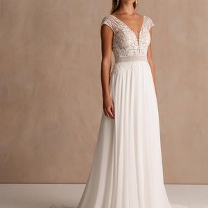 Der Rock fließt sanft in eine A-Linien-Silhouette, die für eine schmeichelhafte Form sorgt und dabei Bewegungsfreiheit bietet. Die Kapellenschleppe verleiht dem Kleid eine majestätische Länge und sorgt für einen beeindruckenden Auftritt beim Gang zum Altar. Trotz der Schlichtheit des Designs strahlt das Kleid eine unverwechselbare Eleganz aus, die durch die klare Linienführung und den hochwertigen Stoff unterstrichen wird.