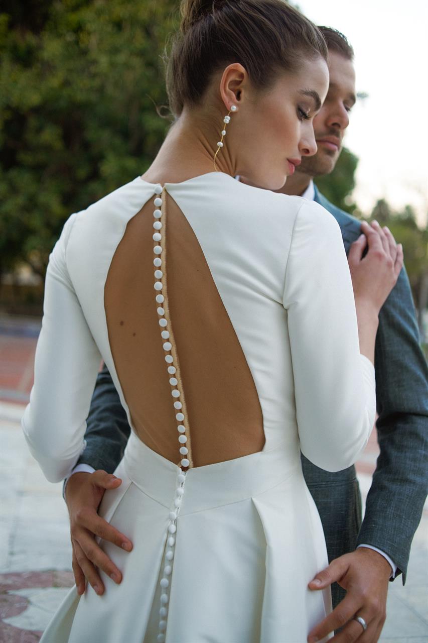 Ein besonderes Detail des Kleides ist der Rücken. Er ist mit einem stilvollen dreieckigen Einsatz aus beigefarbenem Tüll versehen, der eine Illusion eines offenen Rückens erzeugt. Der Rücken wird mit eleganten Knöpfen geschlossen, die sich harmonisch in das Design einfügen und dem Kleid eine klassische Note verleihen. Dieses Detail verleiht dem Kleid einen subtilen Hauch von Raffinesse, ohne die minimalistischen Linien zu stören.