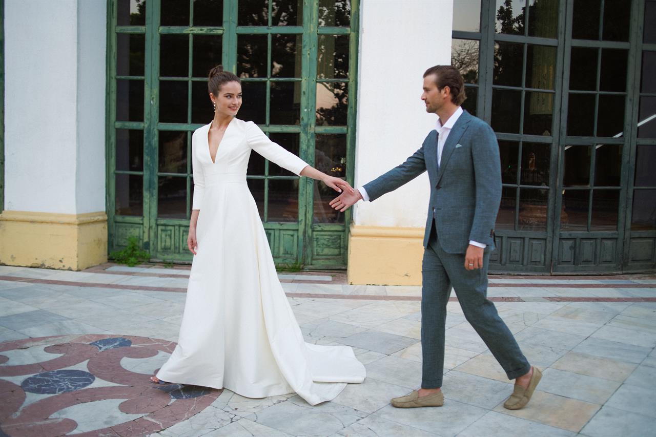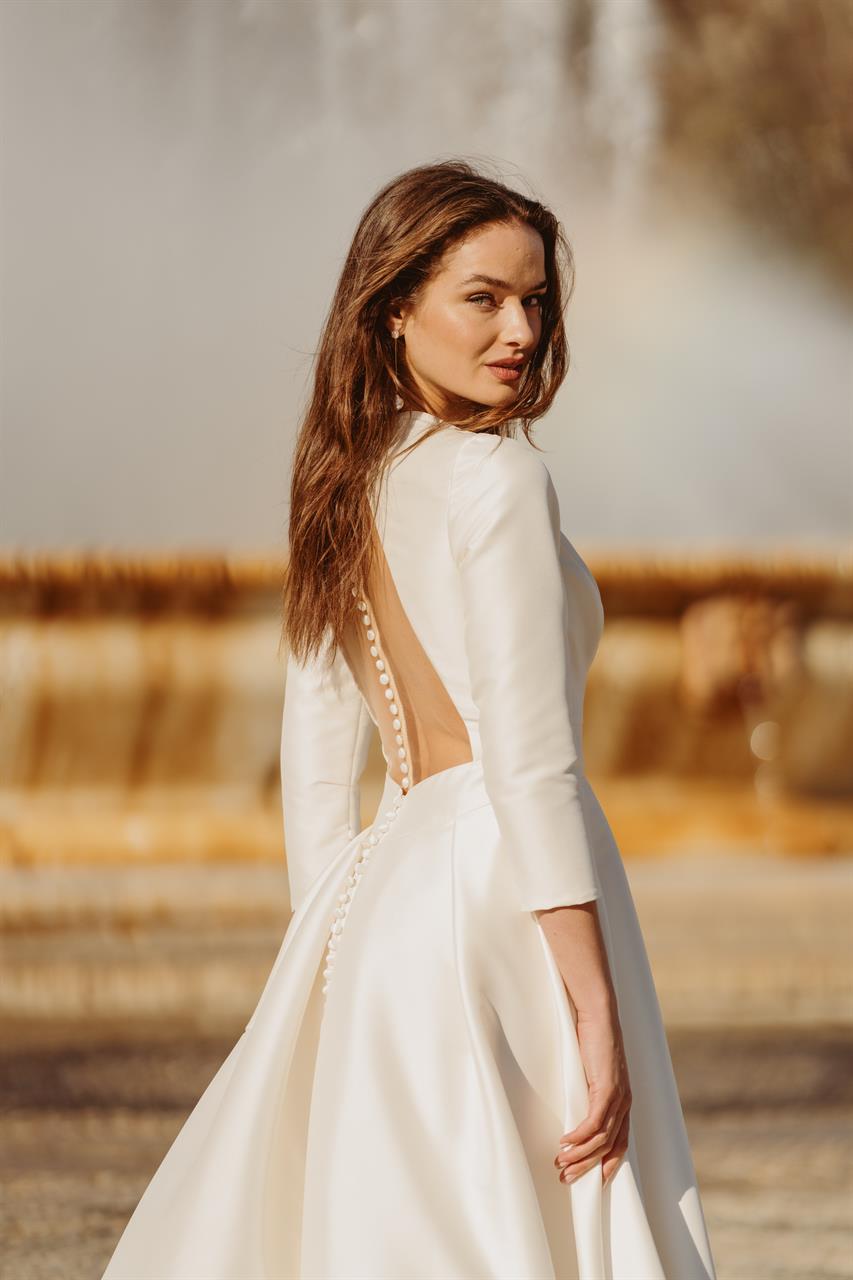 Der tiefe Plunge-Ausschnitt verleiht dem Oberteil eine moderne und verführerische Note, während die langen Ärmel für eine zeitlose Eleganz sorgen. Diese Kombination aus klassischer Bedeckung und einem Hauch von Sinnlichkeit schafft eine perfekte Balance zwischen traditionellem und modernem Brautstil. Der Mikado-Stoff sorgt dabei für eine glatte und strukturierte Optik, die das minimalistische Design betont und dem Kleid eine luxuriöse Ausstrahlung verleiht.