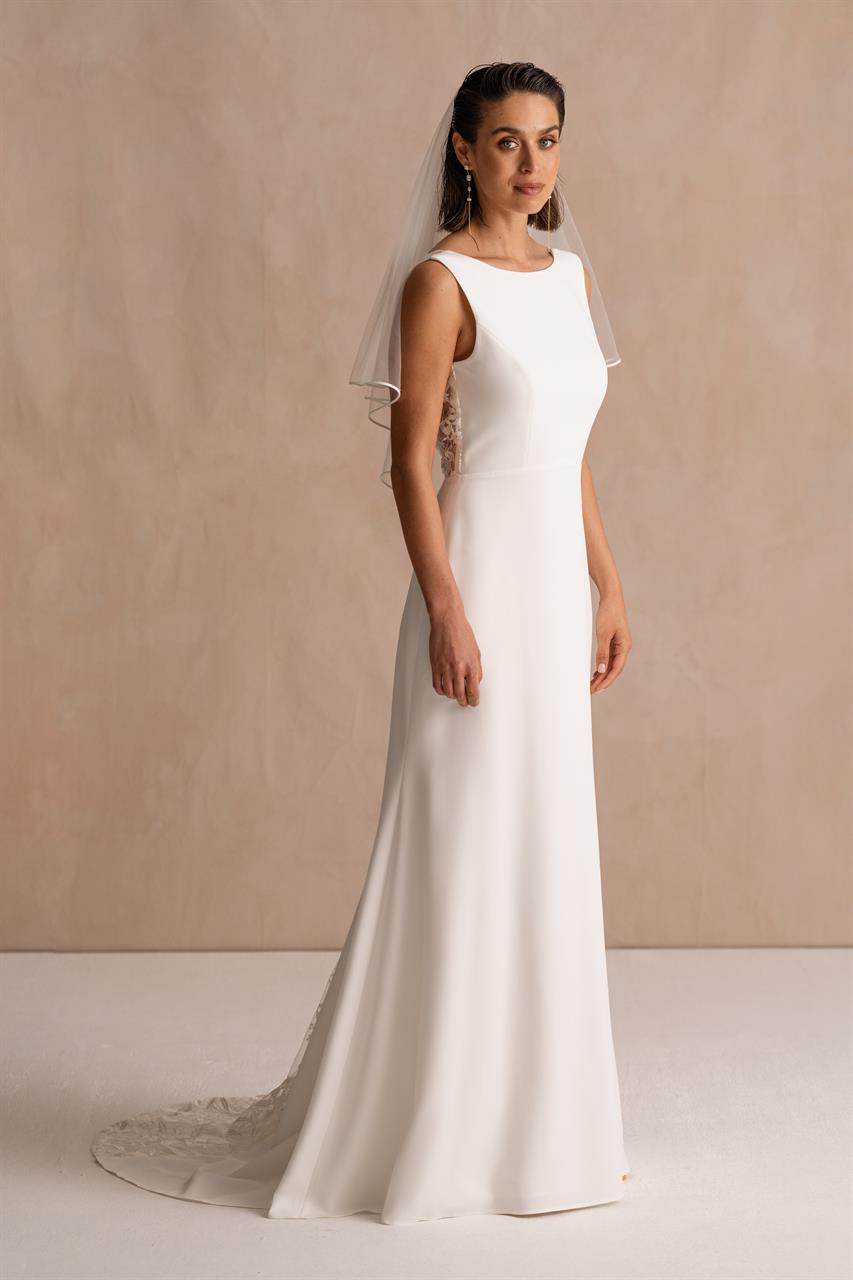 Die Hofschleppe aus Crepe ist leicht und fließend und betont die schlichte Eleganz des Kleides. In der Mitte der Schleppe sorgt der bestickte Tülleinsatz für einen Hauch von Romantik und verleiht dem Design einen einzigartigen und persönlichen Touch.