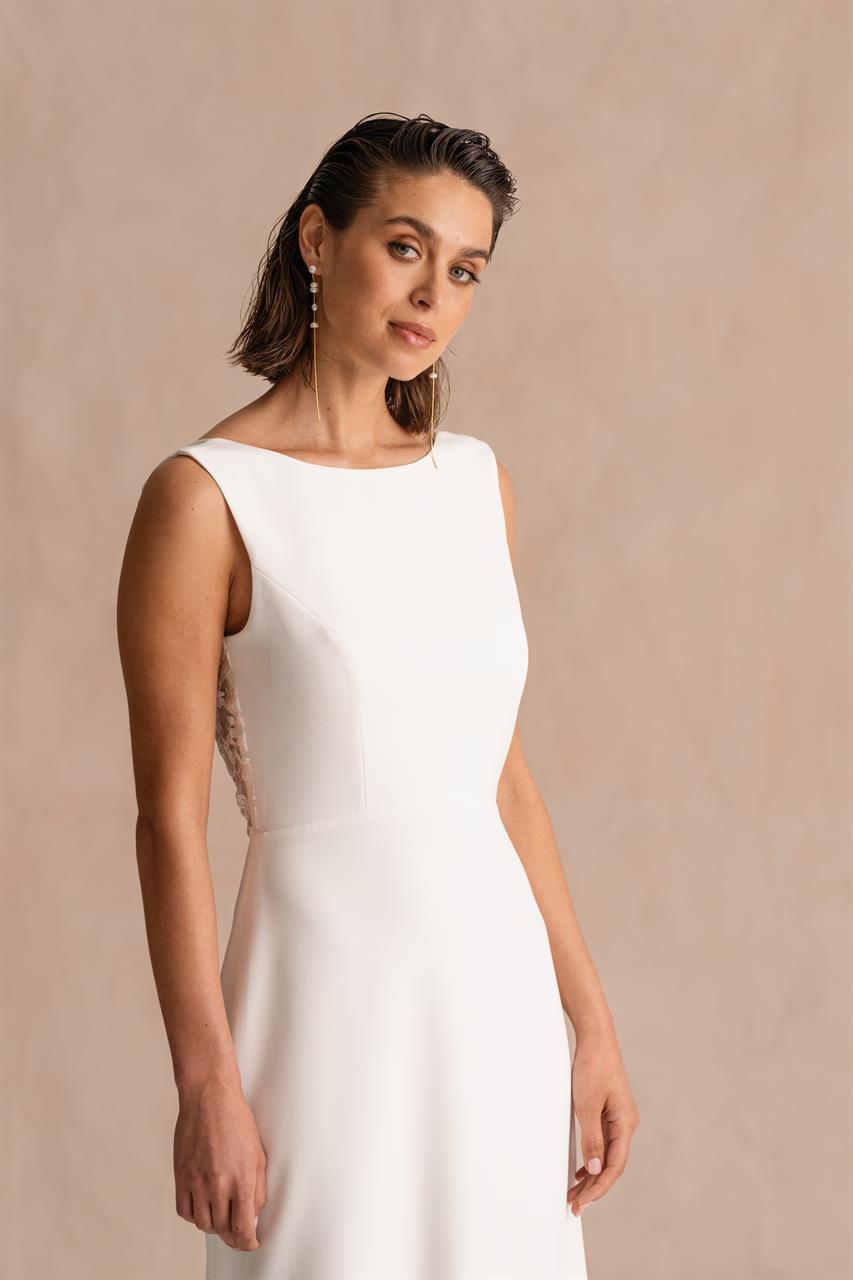 Dieses Brautkleid ist perfekt für Bräute, die auf klare Linien und dezente Details setzen, ohne auf stilvolle Akzente zu verzichten. Es ist eine ausgezeichnete Wahl für moderne Zeremonien, elegante Stadt-Hochzeiten oder intime Feierlichkeiten, bei denen schlichte Raffinesse und zurückhaltender Glamour im Vordergrund stehen.