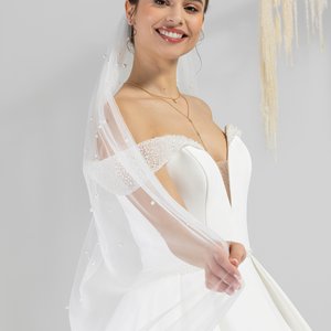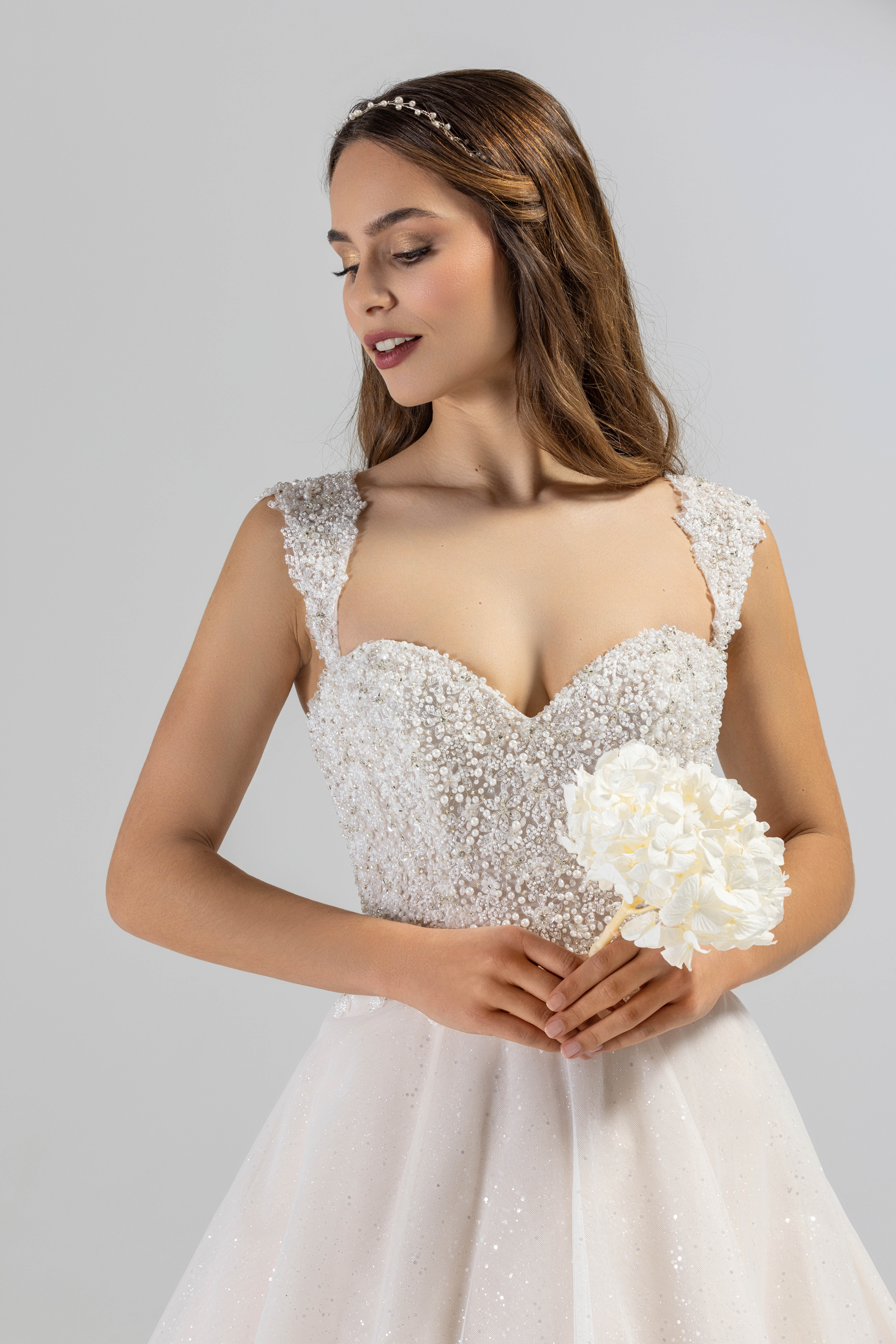 Dieses prächtige Brautkleid vereint luxuriöse Details mit zeitloser Eleganz und sorgt für einen unvergesslichen Auftritt an Deinem großen Tag. Der Herzbüstenteil ist kunstvoll mit Perlen verziert und unterstreicht das Dekolleté auf besonders elegante Weise. Die filigran gearbeiteten Perlenakzente betonen die feminine Silhouette und verleihen dem Kleid eine glamouröse Ausstrahlung. Die Ärmel, die das Dekolleté sanft umrahmen, sorgen für eine zusätzliche romantische Note und setzen stilvolle Akzente.