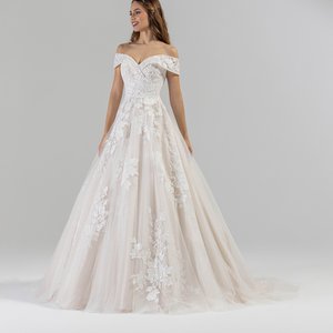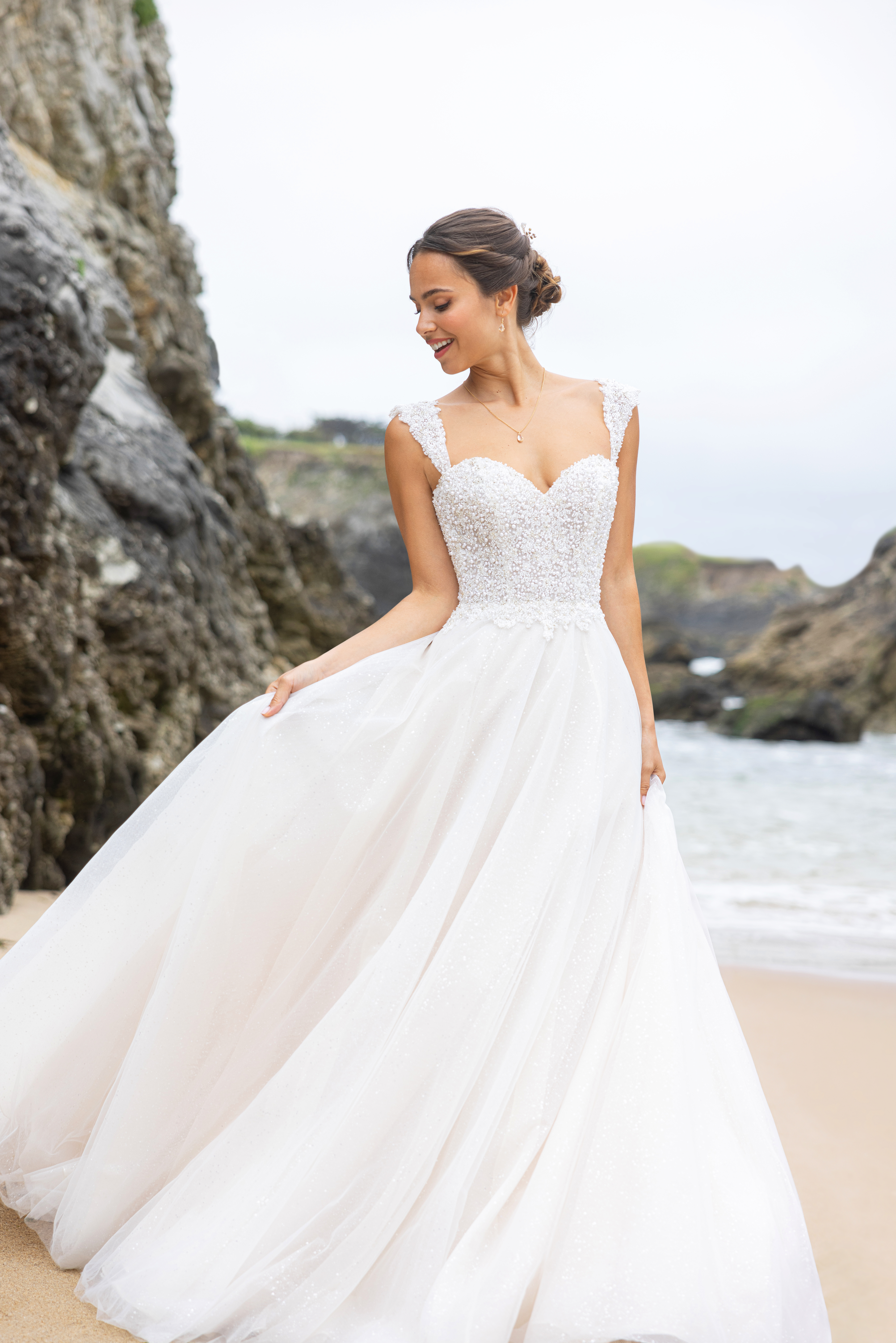 Der Rock fällt in einer eleganten Prinzessin-Form und fließt sanft über den Boden, während der glitzernde Tüll für eine märchenhafte Optik sorgt. Dieses Kleid ist die ideale Wahl für Bräute, die von einem luxuriösen und glamourösen Look träumen und gleichzeitig ihre feminine Seite betonen möchten.