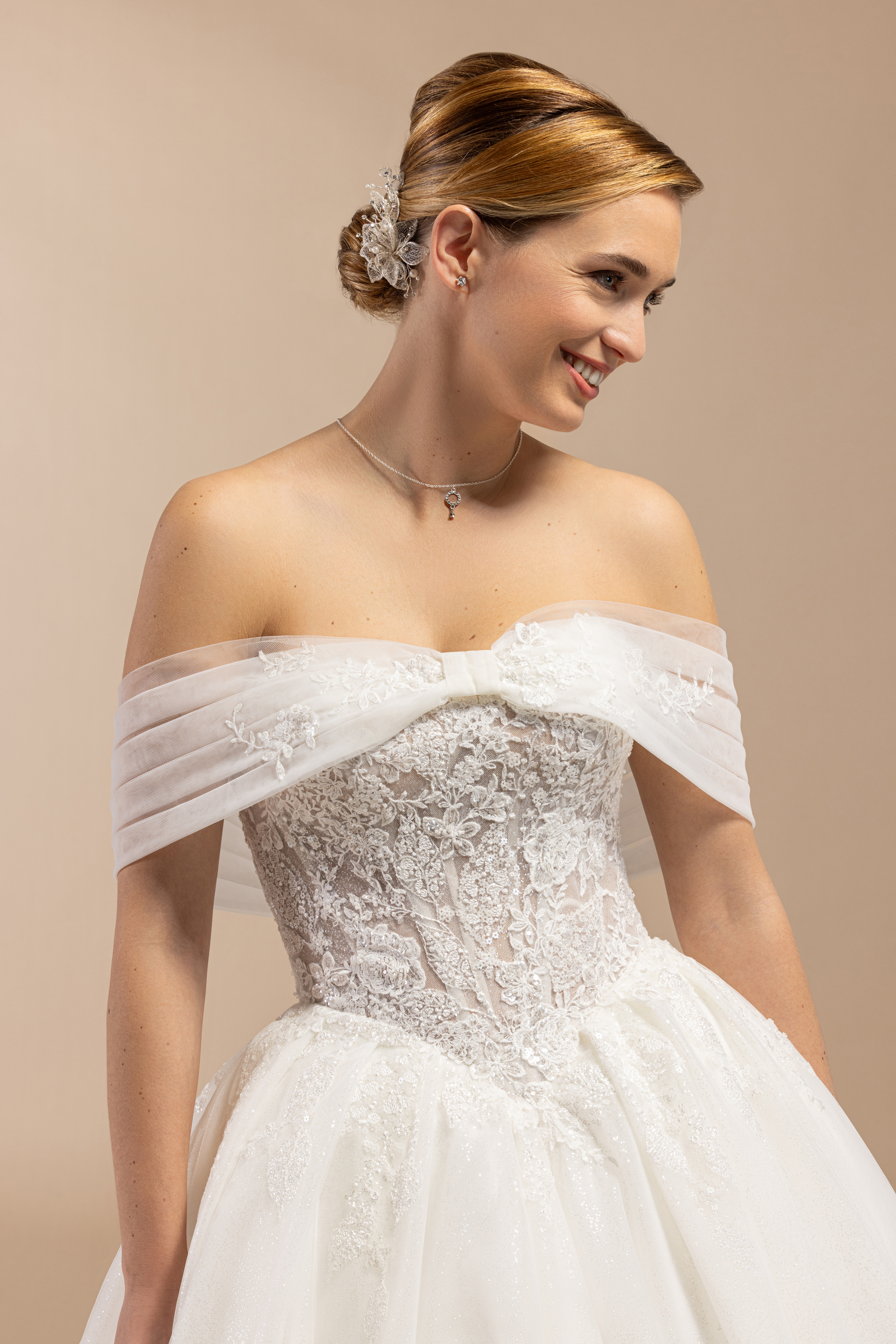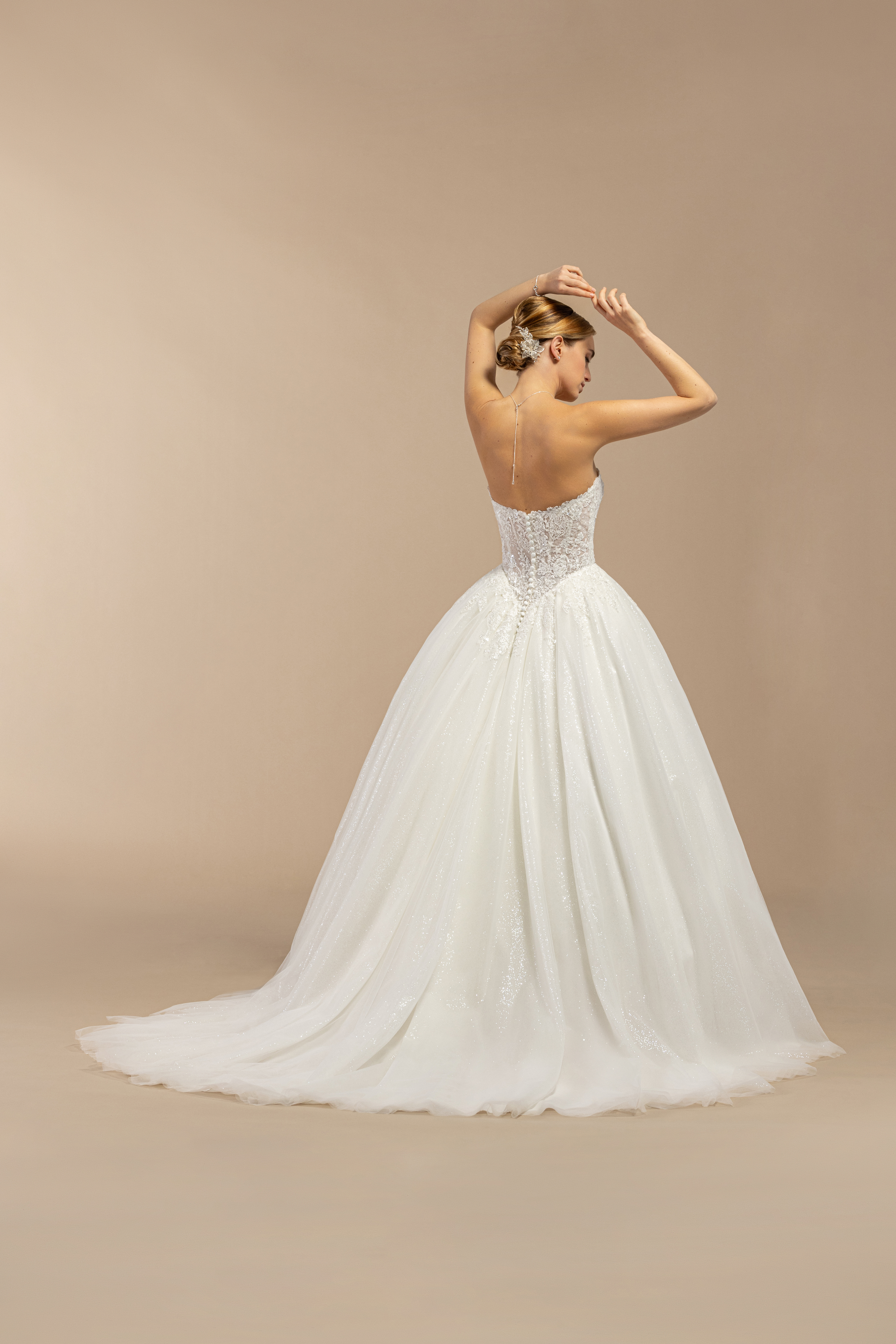 Glam-Faktor pur: Dieses Prinzessinnen-Brautkleid bringt Dich garantiert zum Strahlen! Der voluminöse Rock aus Glitzer-Tüll funkelt bei jedem Schritt und sorgt dafür, dass Dein großer Auftritt unvergesslich wird. Trotz des Volumens wirkt das Brautkleid leicht und modern – perfekt für Bräute, die Eleganz mit einem frischen, jungen Look kombinieren wollen.