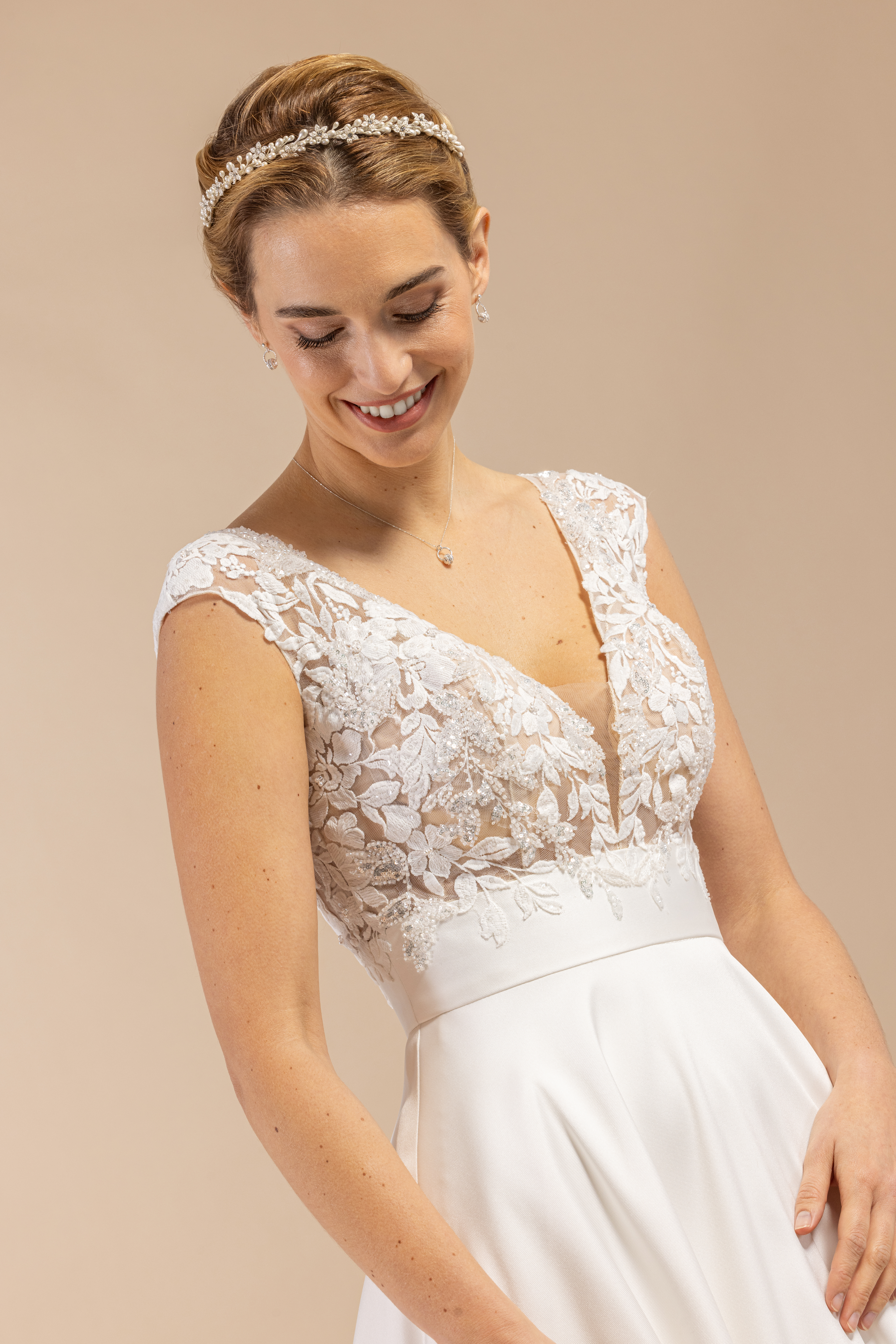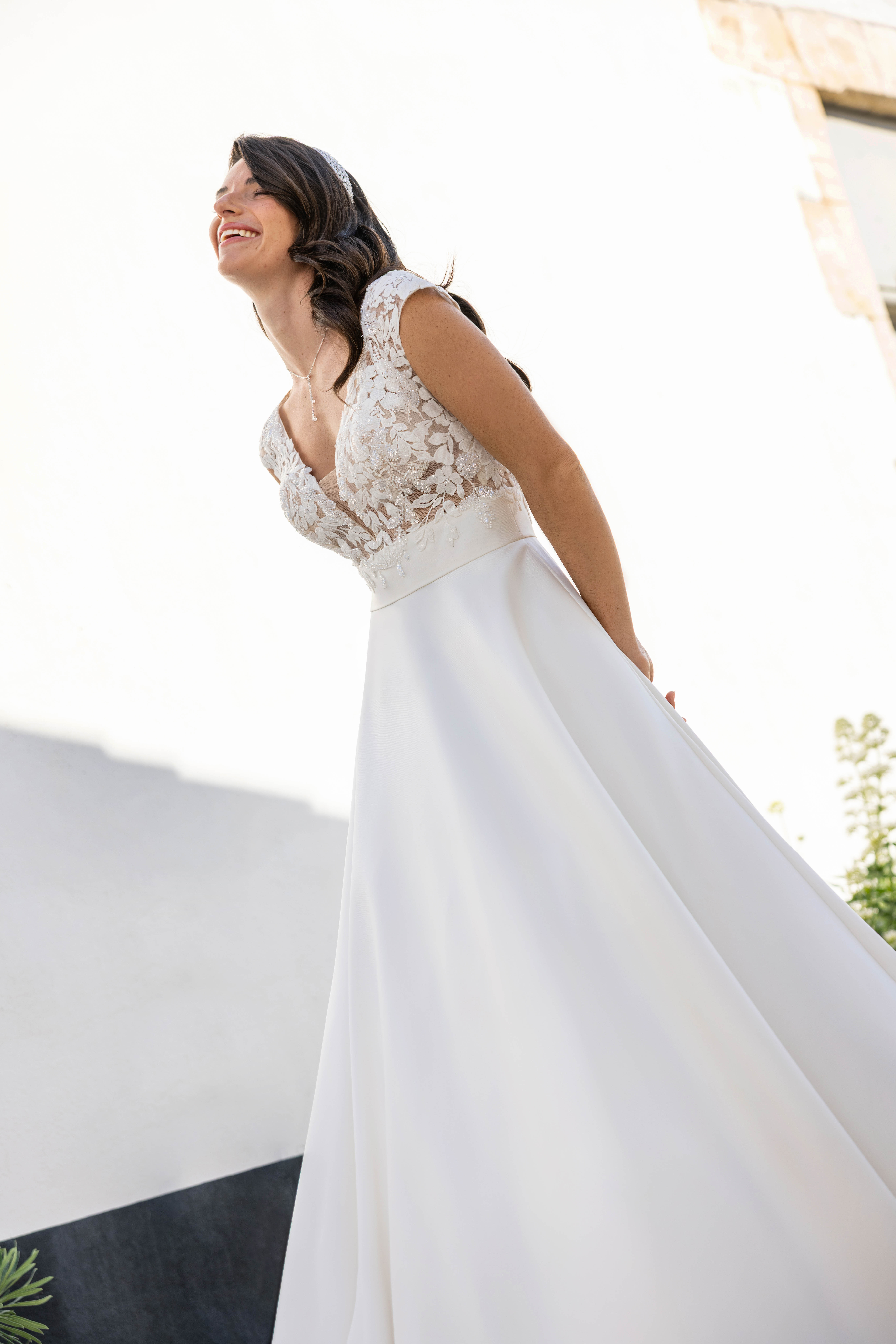 Ein Brautkleid, das alle Blicke auf sich zieht: Dieses Prinzessinnen-Brautkleid kombiniert klassische Eleganz mit einem modernen Twist. Der glatte Mikado-Rock sorgt für eine klare, strukturierte Silhouette, die bei jedem Schritt royal wirkt – gleichzeitig aber superleicht zu tragen ist. Die ausgestellte Form bringt Volumen, ohne Dich einzuengen, und lässt Dich ganz entspannt durch Deinen großen Tag kommen.