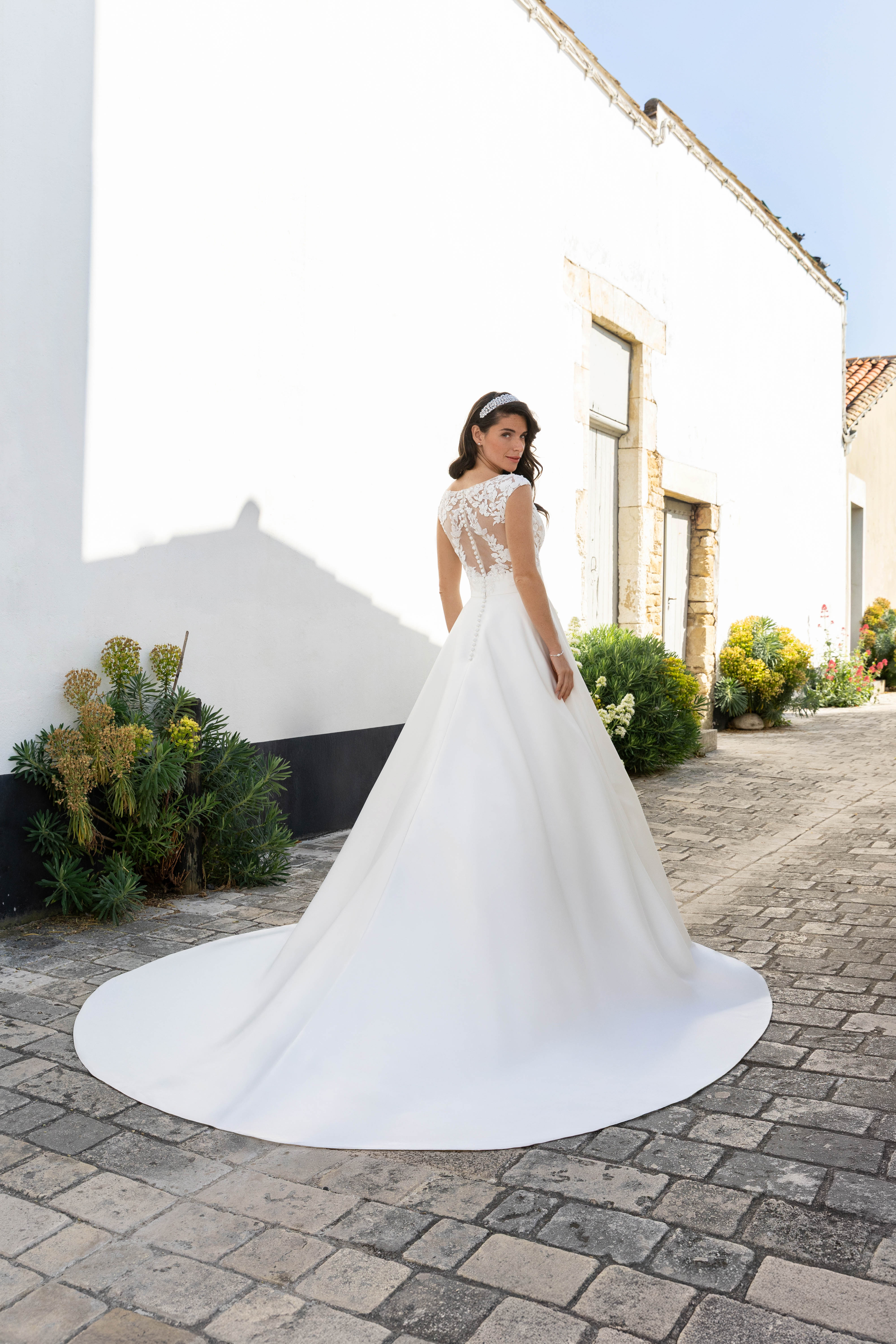 Das Oberteil des Prinzessinnen Brautkleides begeistert mit einer feinen, bestickten Spitze, die feminin und edel zugleich wirkt. Der tiefe Ausschnitt zaubert ein wunderschönes Dekolleté, während die transparente Rückenpartie mit Knopfleiste das gewisse Etwas gibt. Dieser Mix aus cleanem Rock und detailreicher Spitze macht das Hochzeitskleid perfekt für Bräute, die Eleganz lieben, aber nicht auf moderne Akzente verzichten wollen.